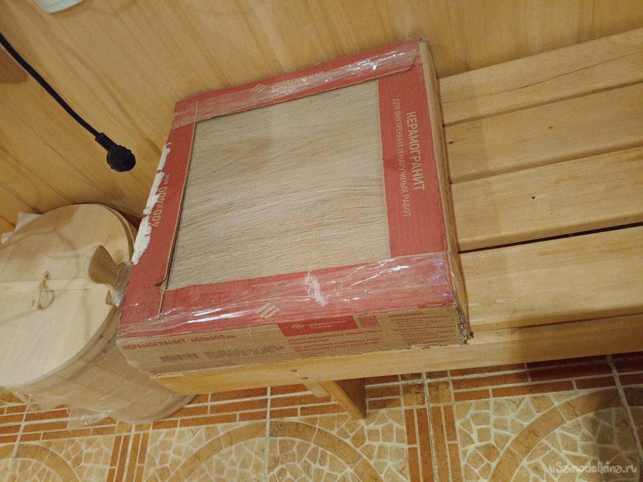 Произвел замеры, демонтируемой части обшивки из вагонки, получился размер 1500х800 мм. Рассматривал различные варианты приобретения уже готовых экранов из нержавейки, листов Магнезита и т.д., но все это мне не подходило. Так же не рассматривал вариант крепления керамогранита на клей, потому что не мог предположить, как поведет себя плитка при значительном нагреве (т.е. например расширение ее будет быстрее и больше чем у клея и вся эта конструкция «торжественно» отвалится, какие зазоры, ну и т.д.). Решил все сделать, по типу вентилируемого фасада, тем более остались у меня специальные кронштейны, после ремонта подвального помещения дома. Керамогранит, для оптимальности, подобрал размером 40х40 мм., расцветкой примерно под интерьер. Но не все так просто, по факту цвет плитки, при неярком освещении парилки, давал совсем другой результат, пришлось производить замену плитки в магазине.
