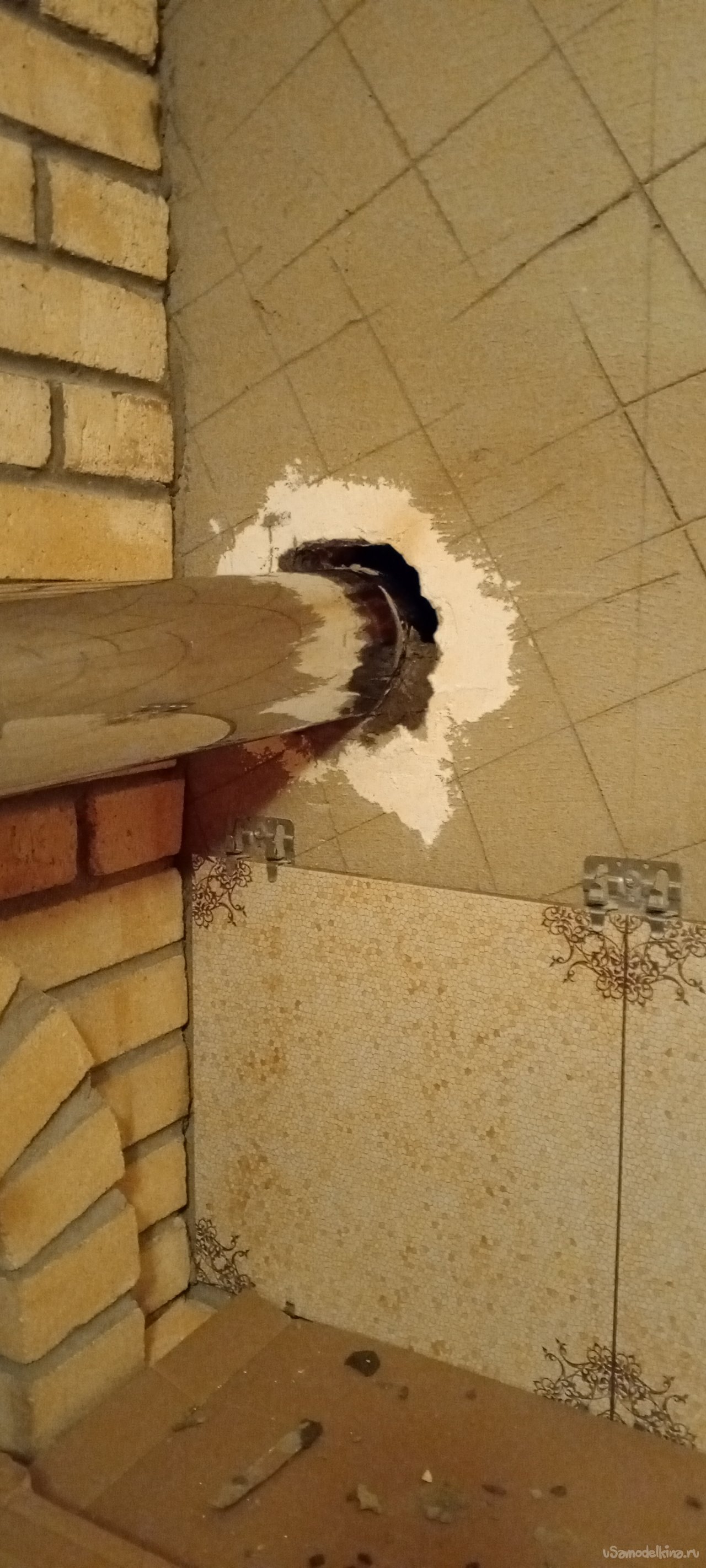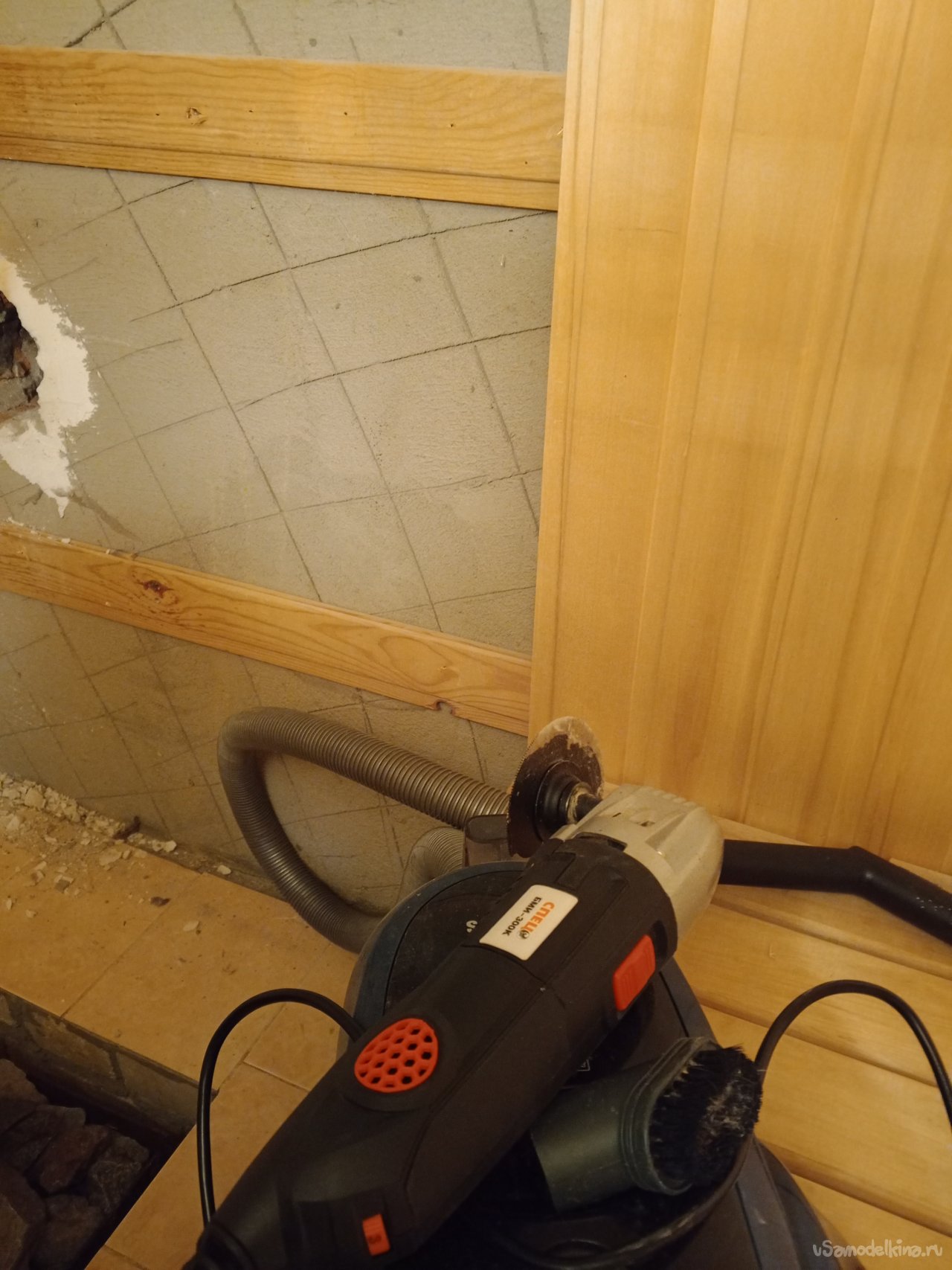 Снял часть вагонки с обрешетки стены, а также демонтировал газоход. При помощи МФУ, срезал по месту торчащие части обрешетки.