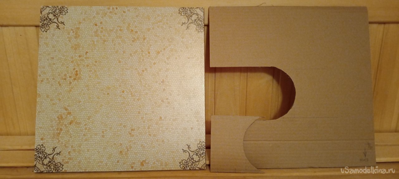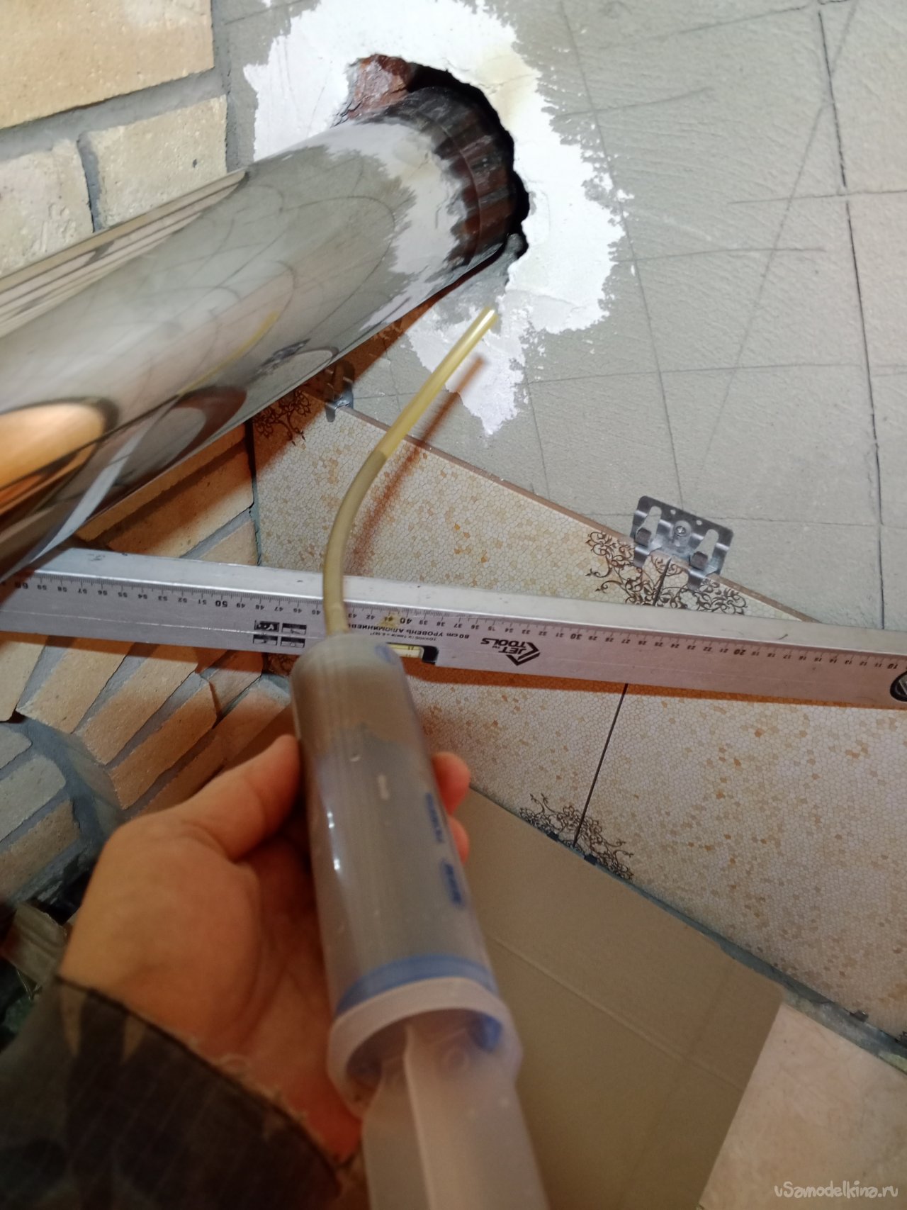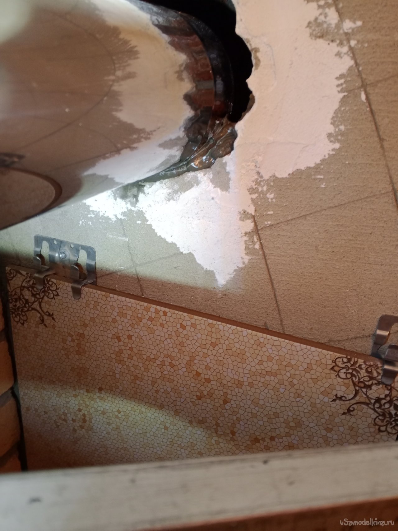 Из картона вырезал шаблон для формирования отверстия под трубу в плитке. В соответствии с шаблоном вырезал «фасонку» и установил на место.