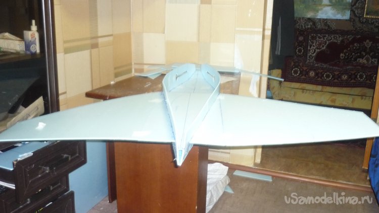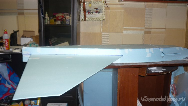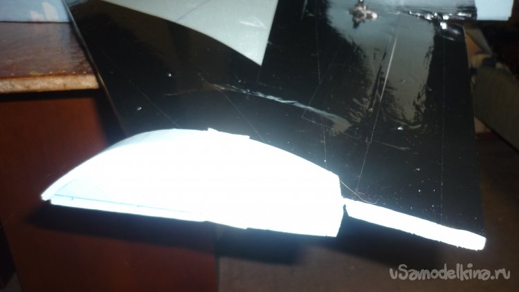 Склеиваю два слоя заготовок для ПГО, навешиваю руль высоты примериваю готовое ПГО на фюзеляж и монтирую.