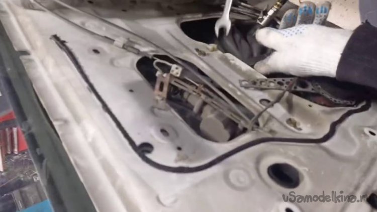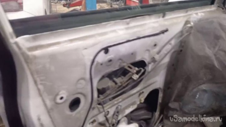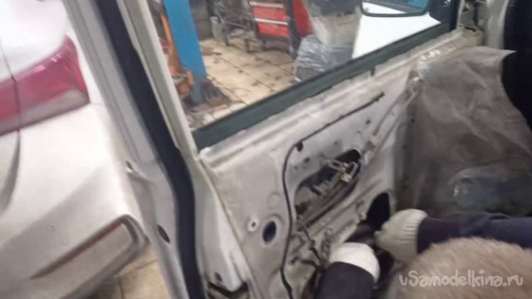 Снимаем обшивку двери. Сначала мои помощники (профессиональные мастера авторемонта) хотели разобрать всю начинку двери, но потом, поразмышляв, решили, что это очень трудоёмко, и ничего лишнего делать не стали.