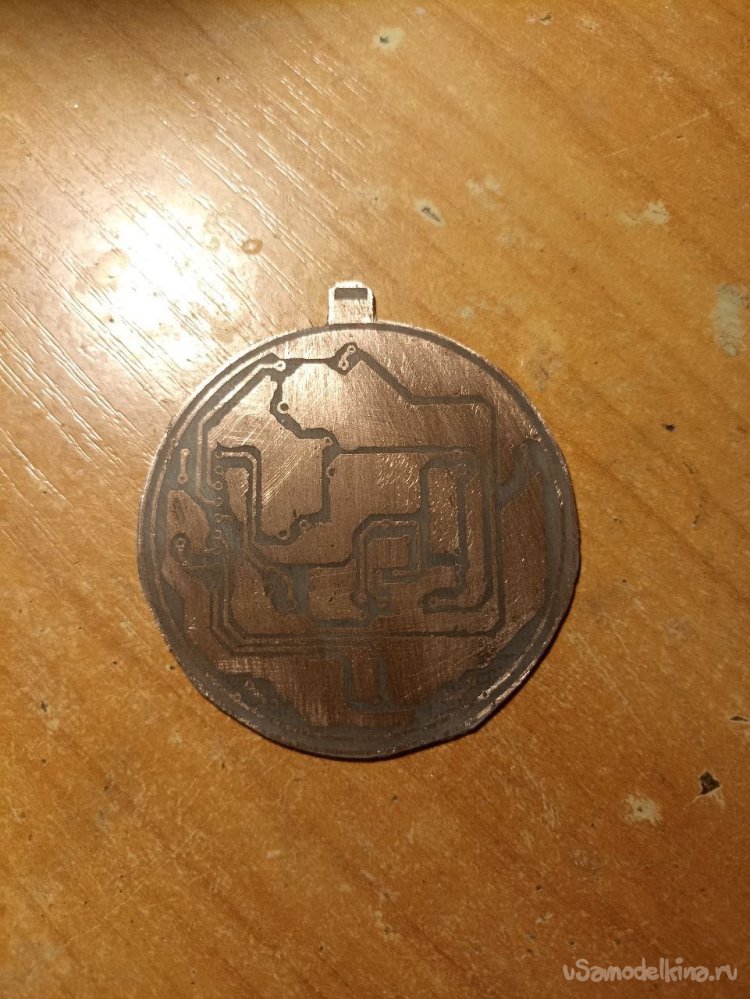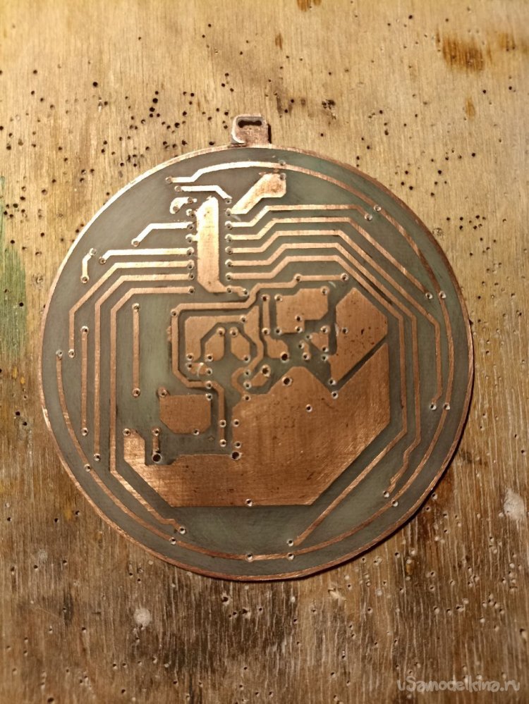 И, как видно, не особо-то у меня вышло… Где-то покрытие получилось неровным, где-то вообще облупилось. Ещё и через отверстия смесь на обратную сторону платы попала, благо, что растворителем её оттуда получилось убрать. В общем, страх и ужас. Но… как говорится, первый блин комом, ничего не попишешь. Если издалека и без очков – то даже симпатично.