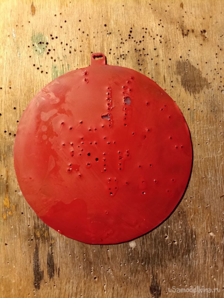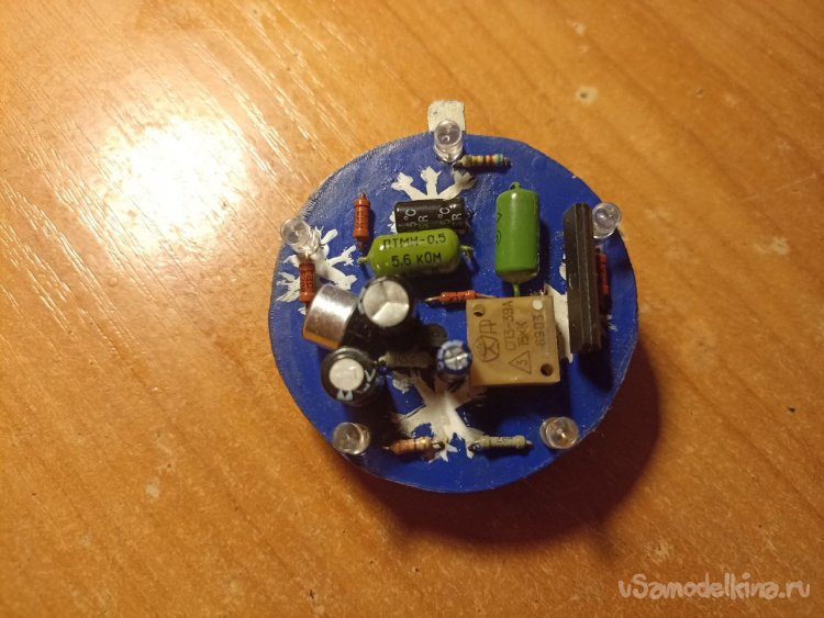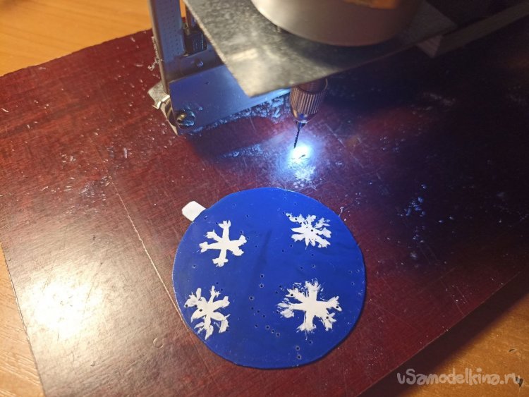 И покраска. Вот с этим мне прям не везёт! Вместо паяльной маски в этот раз я решил использовать обычный лак для ногтей синего цвета. В целом, хоть слой и получился слегка неровным, что видно, если разглядывать плату на просвет, покрытие получилось довольно симпатичным. Но вот дёрнул меня чёрт сделать шарик «более весёлым» и нарисовать на нём снежинки! У китайцев на конструкторе, вон, разрисованное, а я что, хуже что ли? В общем, лаком эти художества получились ну очень не очень… А чтобы их стереть, надо было бы убирать всё покрытие целиком, поэтому уже оставил как есть.