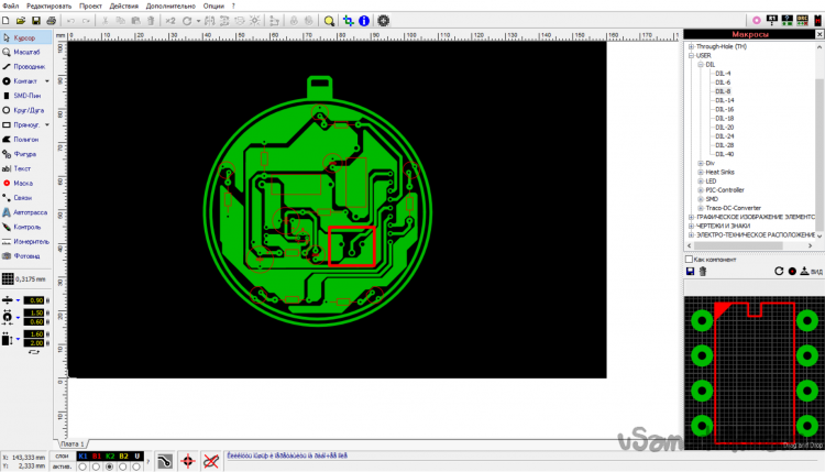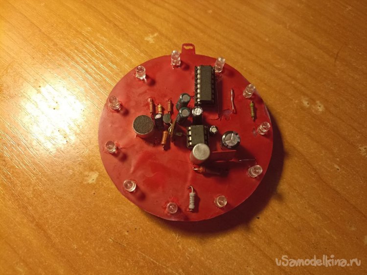 За это время были найдены все нужные детали (в частности, микросхема – пришлось заказывать в Китае, потому что в радиомагазинах города таких не нашлось) и сделана разводка платы (так как схема сама по себе проще – за счёт того, что использован менее чувствительный усилитель на одном транзисторе, иначе первый светодиод светился бы постоянно – размеры платы так же удалось сократить, с 8,5 до 6 сантиметров в диаметре).