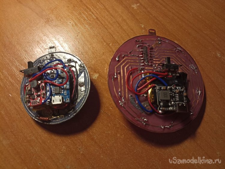 Ещё я добавил в оба шарика питание от аккумулятора – припаял модуль контроля заряда и повышающий модуль и прихватил всё это дело термоклеем. Да, не особо аккуратно… Зато не надо тянуть кабель питания, или думать, как закрепить на плату Крону. Да и не видно с обратной стороны всё равно.