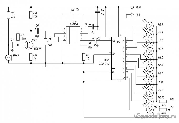 Кроме неё для сборки понадобятся следующие детали – микросхема усилителя LM386, электретный микрофон, транзистор BC547, конденсаторы – пять штук на 10 мкФ, по одному на 100 мкФ и 47 нФ, резисторы – два по 470 Ом, по одному на 10 Ом, 1 КОм, 10 КОм, 27 КОм, один переменный на 10 КОм, ну и сами светодиоды, конечно же, 11 штук.