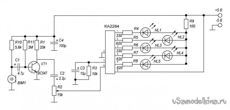 Тогда я решил поискать ещё. И, на том же сайте, в той же статье, нашёл ещё одну светомузыкальную схему. Она была построена на ИМС КА2284, и светодиоды в ней загорались по следующему принципу – чем громче звук, тем больше светодиодов светится. Вполне себе аудио-визуализатор – простенький, но рабочий.