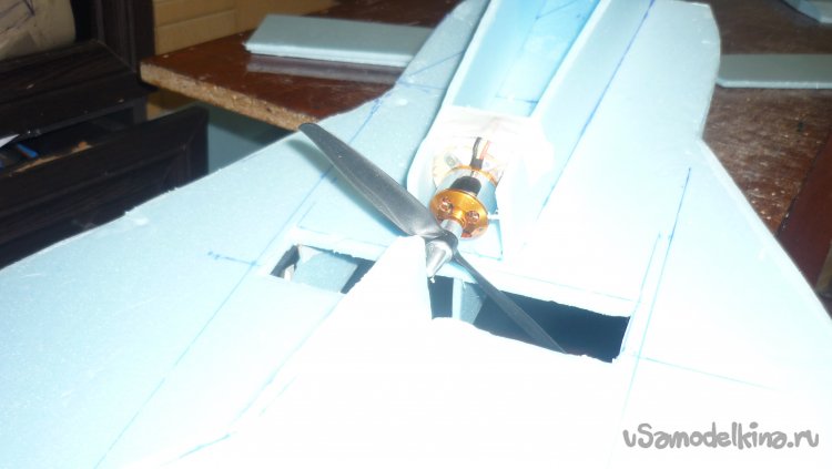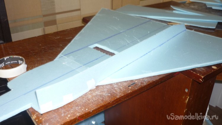 Склеил две заготовки верхнего и нижнего слоя несущей поверхности модели, вырезал отверстие для винта и укрепил кромки крыла полосками подложки.