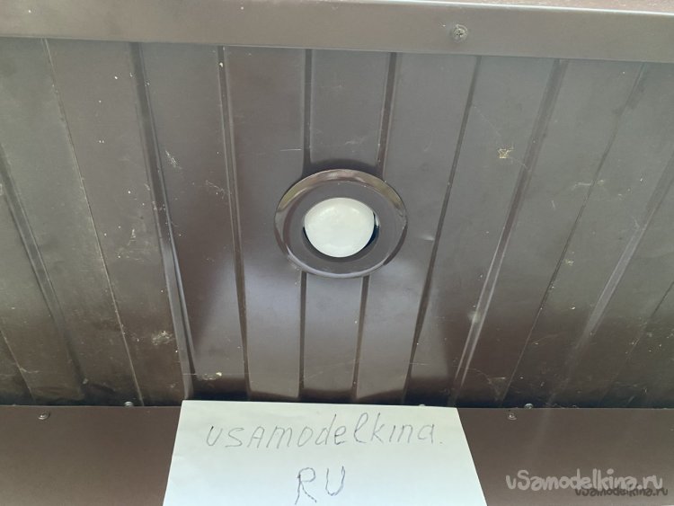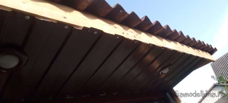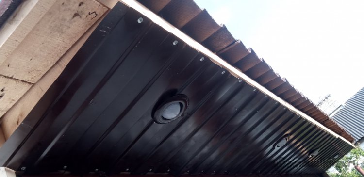 А наружное освещение я выполнил "по классической схеме" - вставил точечные светильники в подшивку свеса кровли. Подшивал профлистом. Он у меня был в наличии. Тоже хранилось много лет несколько листов, оставшихся толи от забора, толи от калиток.))). Вот его и использовал:
