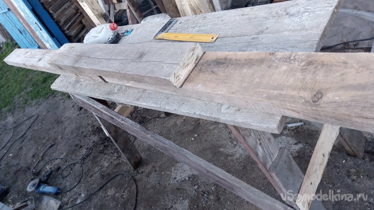 К слову сказать, никаких стройматериалов я не покупал. В качестве вертикальных столбов использовал стропила, оставшиеся от строительства загородного дома и пролежавшие там с "нулевых" годов))). Сечение стропил было 100х150. Ручной циркуляркой я их обрезал, сделав столбы 100х100. После чего слегка прошёл электрорубанком, "убрав серость". Там-же нашёлся старый брус 50х150 (или это уже доска?). Такой-же давности. Сшив две штуки куском её-же, я получил верхнюю несущую поперечину достаточной длины и прочности.