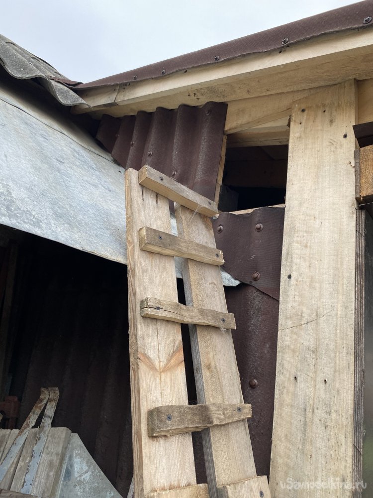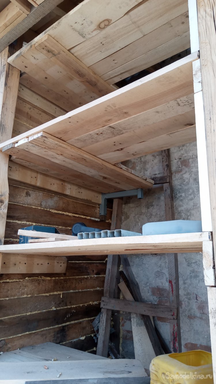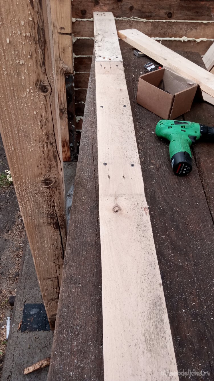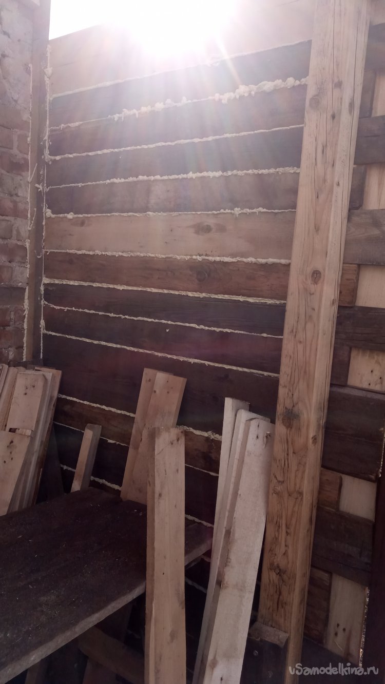 Вот из них я и сделал всё остальное. Даже стропила кровли. Крыша односкатная и короткая. Так что, сшивая шурупами берёзовые крепкие доски от поддонов попарно со смещением на половину длины, я получил стропила, сечением 50х100 нужной мне длины. Такими-же "халявными" досками зашил боковые стенки, и сплошным слоем зашил кровлю.