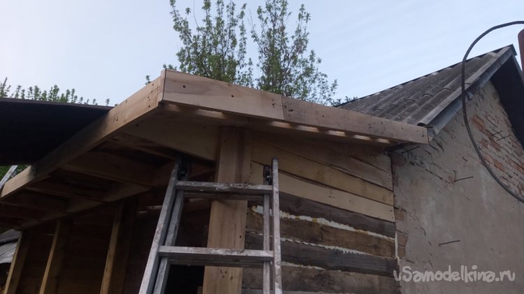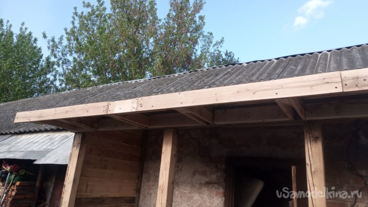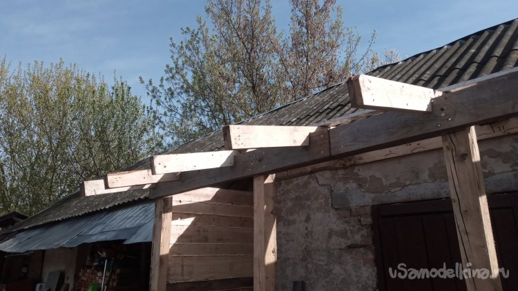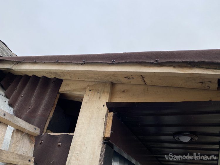 Конечно, ондулин сам по себе - так себе кровля. Он и был придуман, как быстрая временная кровля... Хоть наши "продаваны" это и умалчивали)))). Даже наоборот - озвучивали вовсю, что такая кровля и долговечнее и экологичнее шиферной. Но, со временем, народ разобрался что к чему. А тут ещё и бывший в употреблении ондулин.... Но я подумал, что, во-первых, "не церковное строительство", а, всего-лишь, навес перед сараем.... А во-вторых, доступность халявной доски позволила мне сделать под ним крепкую сплошную плоскость! А при отсутствии деформаций никуда он не денется!!! На мою жизнь хватит!
