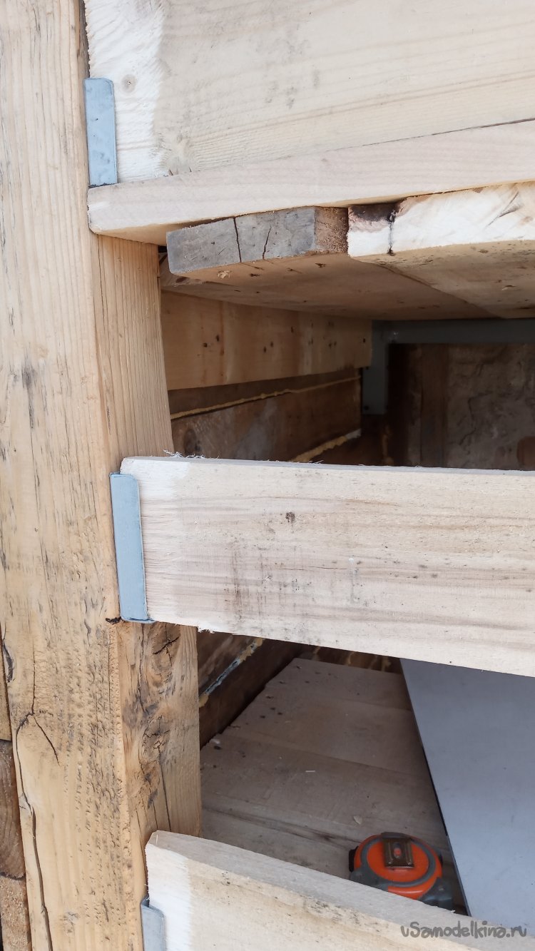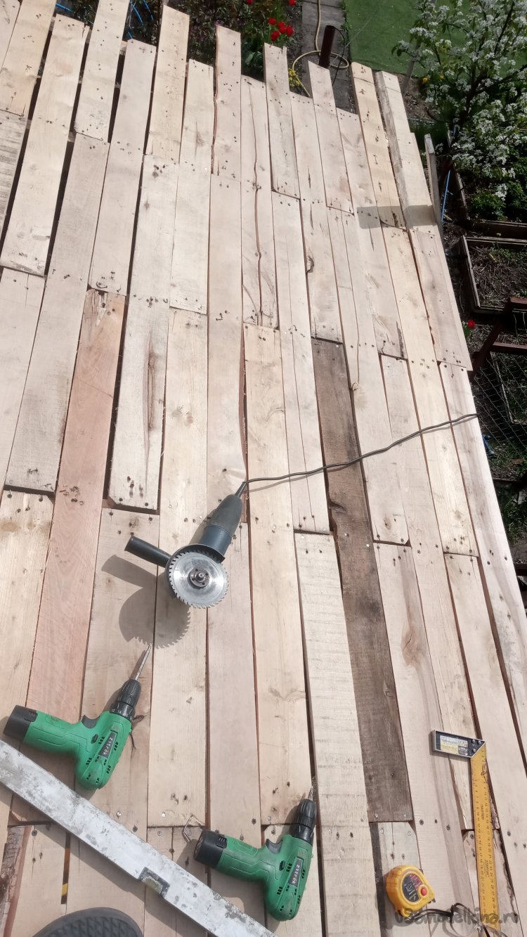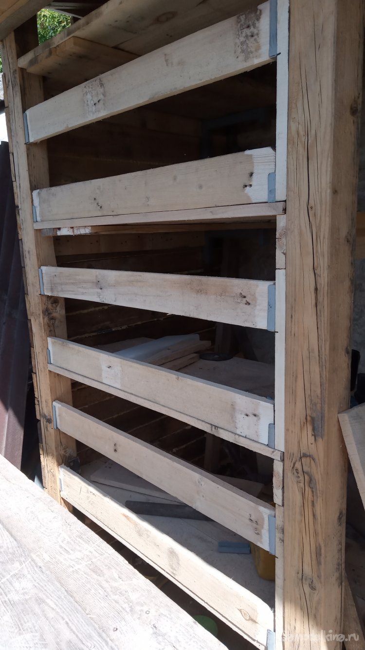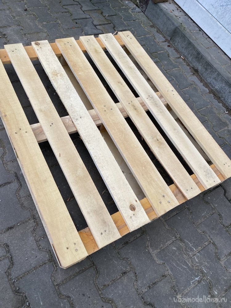 Всё остальное делалось из доски из поддонов! Я разбирал нестандартные поддоны, которые достались бесплатно. Они были совершенно новые, из берёзовой доски. Просто, они были нестандартного размера, поэтому, не годились для использования по прямому назначению.