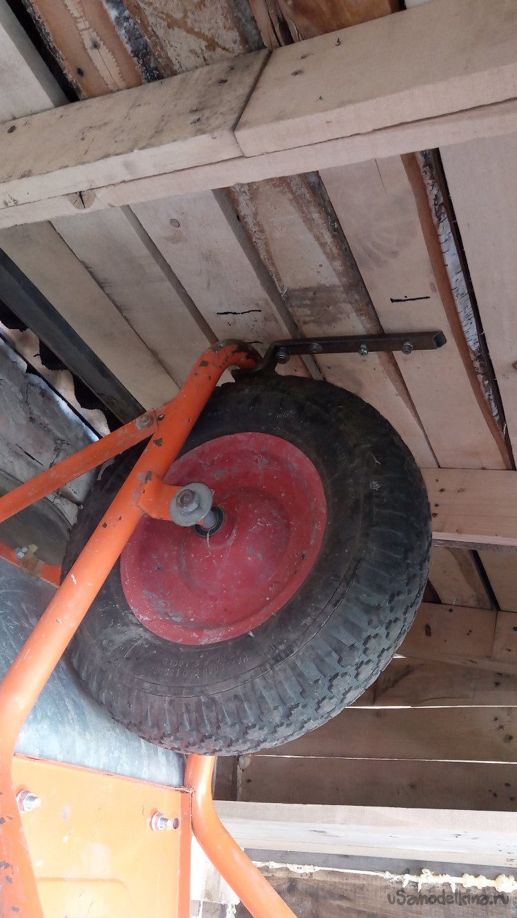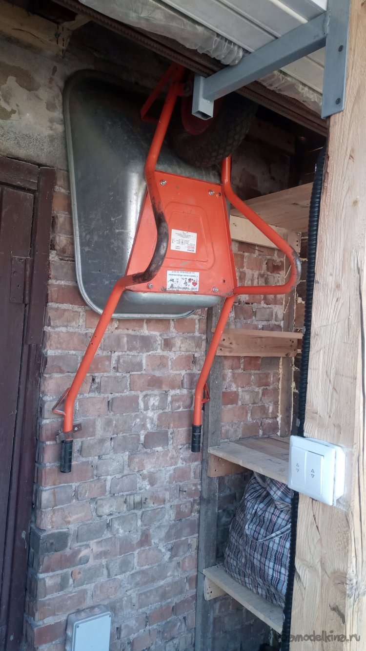 И ещё надо определить место жительства тачки. Она тоже используется редко, так что надо опираться не на эргономику, а на экономию пространства. Я решил её повесить на стену справа от входа в сарай. Она у меня одноколёсная, поэтому я закрепил на потолке крюк, на который она одевается передней защитной дугой, а на стене - простейшую задвижку для фиксации рукоятки.