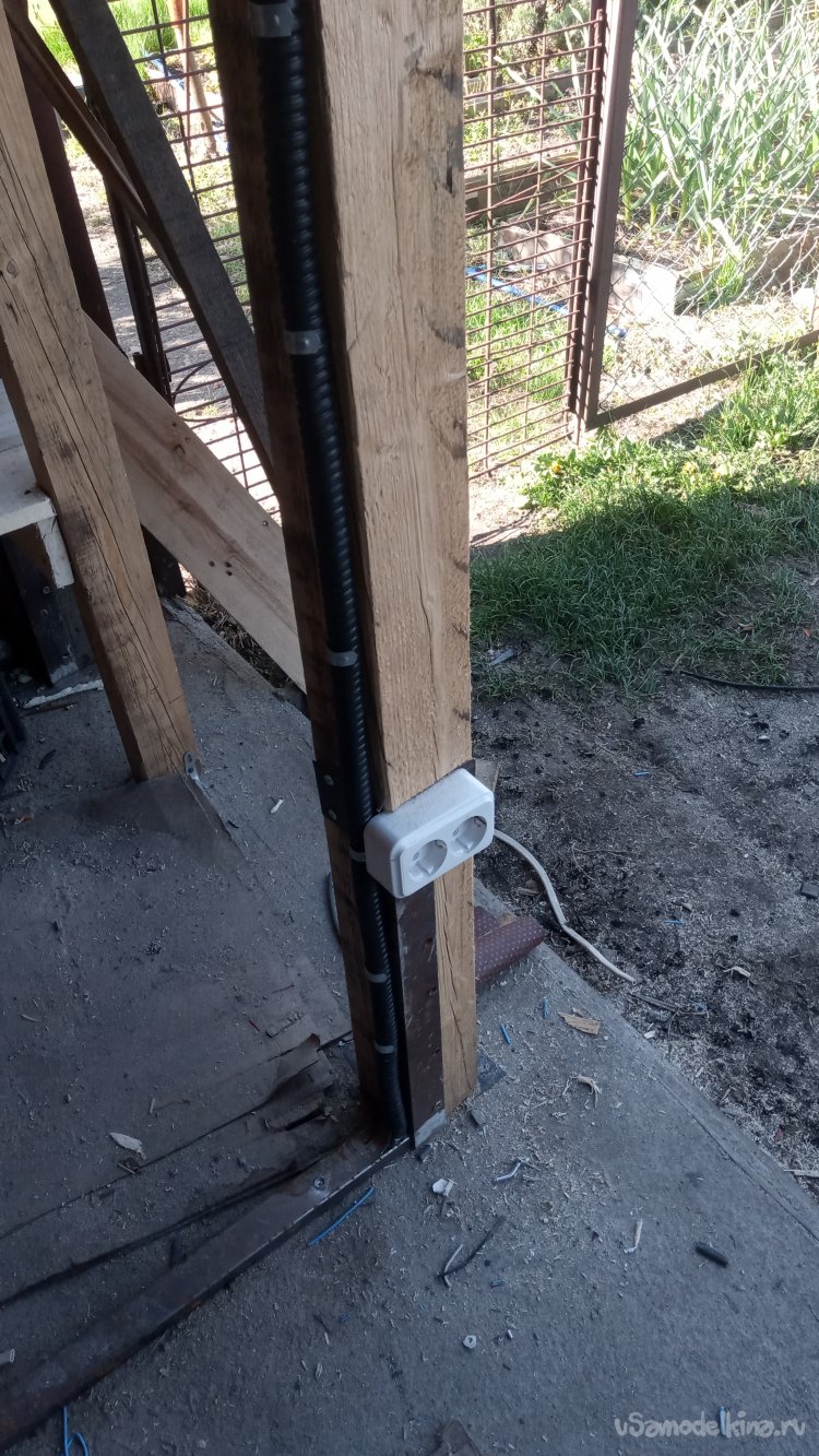 Провёл электрооборудование. Все провода расположил в крепкой металлической гофротрубе с полимерным покрытием. Это, всё-таки, сарай! Так что, не исключён случайный удар по проводу каким нибудь инструментом, или железякой. На столбе, справа от входа разместил розетку и выключатель. И то, и другое подобрал из остатков "электрохлама", целая коробка которого у меня скопилась с моих многочисленных строек.