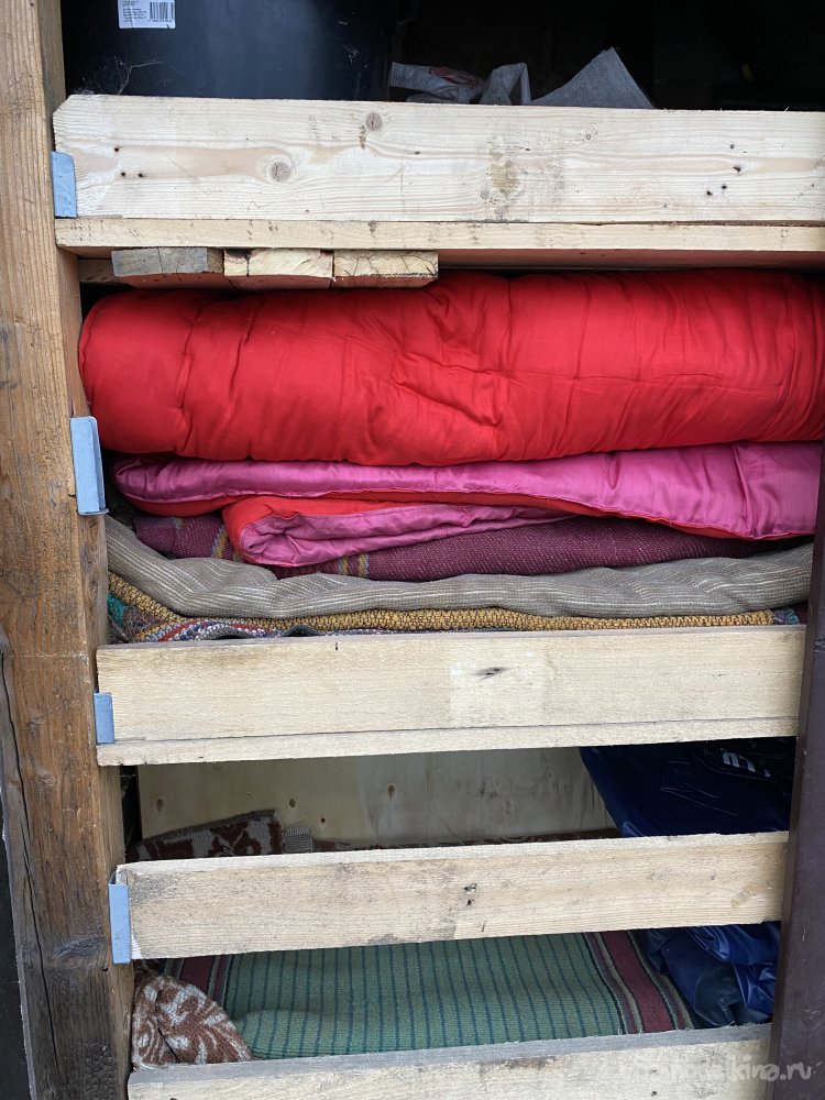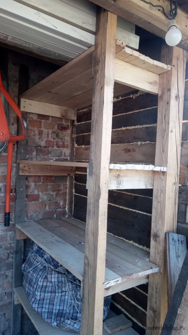 Дальний торцевой стеллаж не имеет нижних полок. Для того, чтобы там могли стоять газовые баллоны и прочее такое. А основной доступ к боковому стеллажу я изначально планировал сделать снаружи. Там мне надо хранить "садово-развлекательные" принадлежности - пледы, подушки, чехлы, скатерть для уличного стола, и так далее. По своему опыту знаю, что любое свободное место со временем обязательно захламляется! И, если сделать доступ к этому всему изнутри, то будет неудобно, потому что, во-первых, надо заходить внутрь и выходить, к примеру, со стёганным одеялом, которое мы стелим на садовые качели. Им обязательно в ограниченном пространстве что-то зацепишь, что-то опрокинешь, а то и порвёшь само одеяло.)))) К тому-же, перед стеллажом обязательно со временем что-то на полу будет стоять, что тоже затруднит добычу тех-же подушек/одеял)))