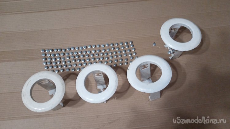 А сами светильники у меня были в запасе. Когда-то давно мне их отдал бесплатно знакомый прораб, так как они выбрасывались при реконструкции административного здания. Их было много. Некоторые со следами коррозии. Я использовал их и в самоделках, и в уличном освещении. Вот и сейчас выбрал несколько и покрасил из баллончика. (Заодно красил шляпки шурупов для другого проекта))):