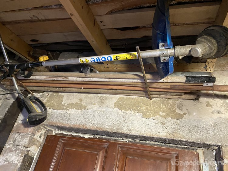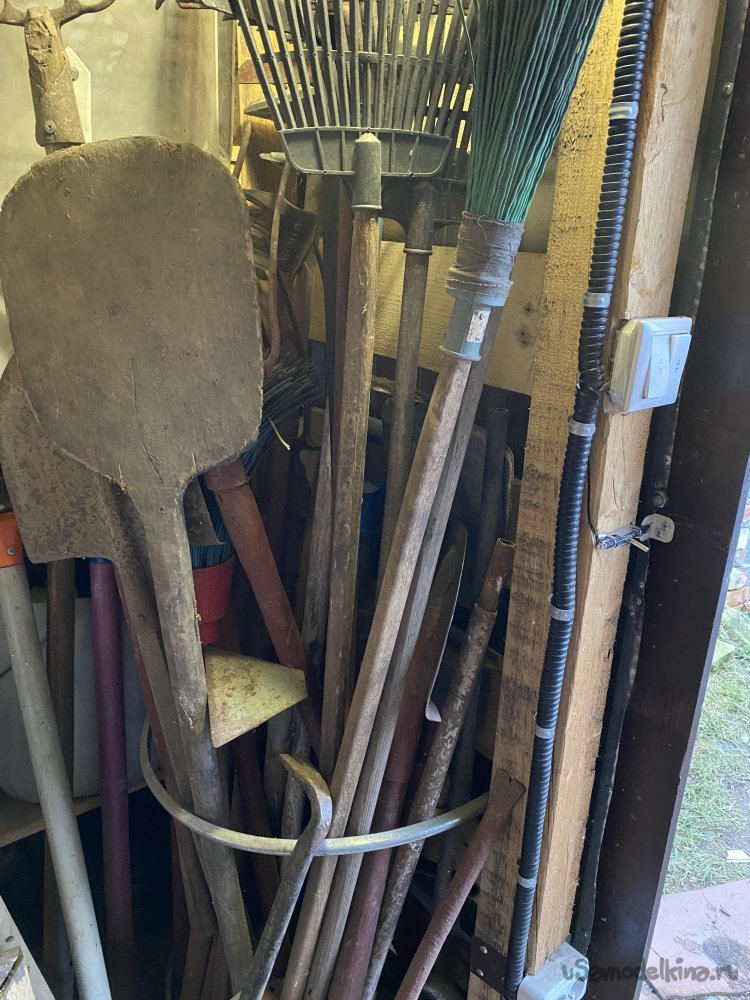 На стене напротив, над входом в сарай, у меня поселились запасные черенки для лопат-грабель и такая, крайне неудобная в хранении вещь, как триммер! Для этого я просто забил в стену куски арматуры, предварительно засверлив перфоратором отверстия.