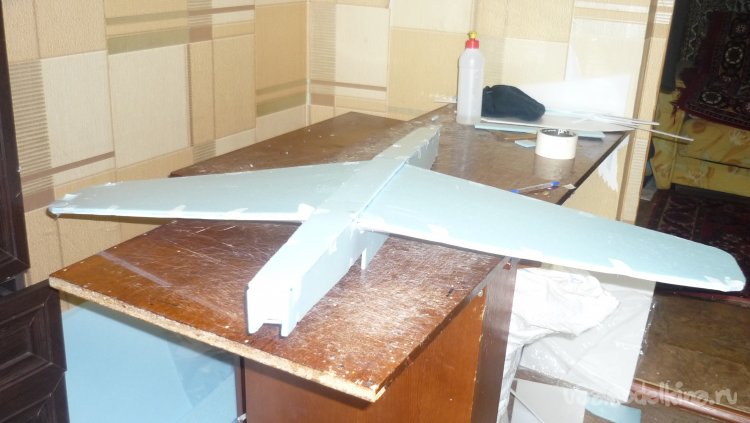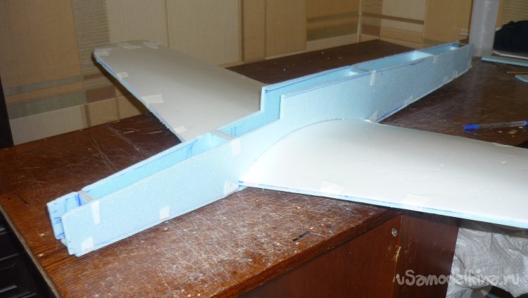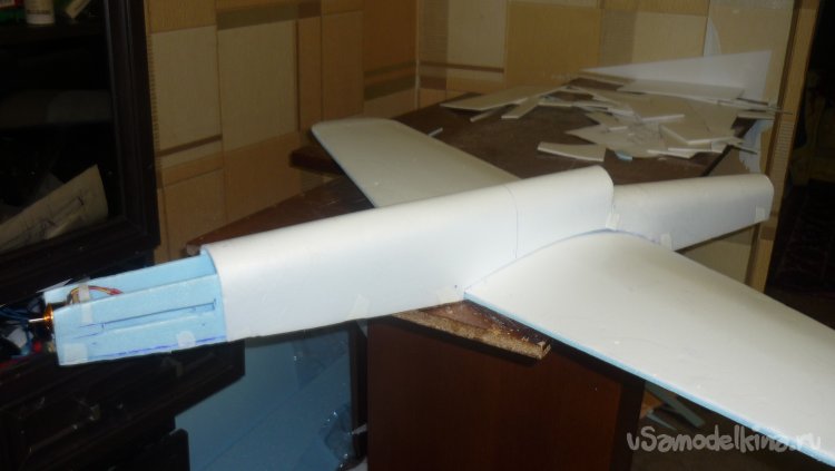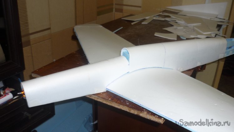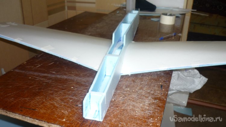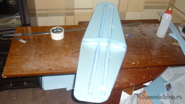Склеиваю два слоя заготовок и монтирую стабилизатор и кили.