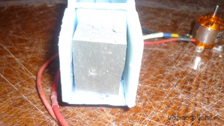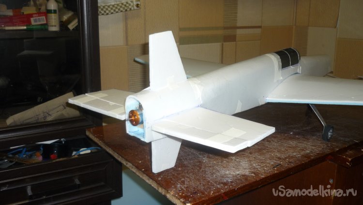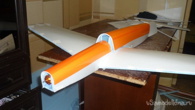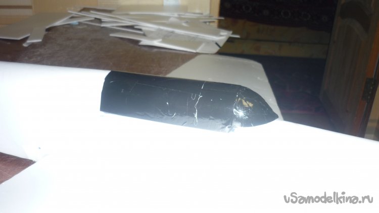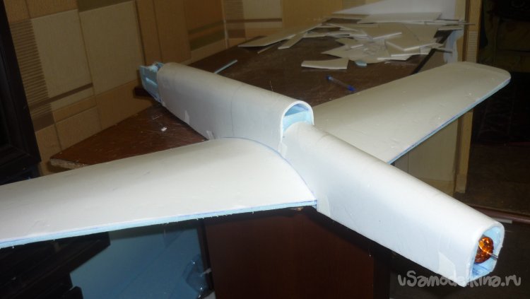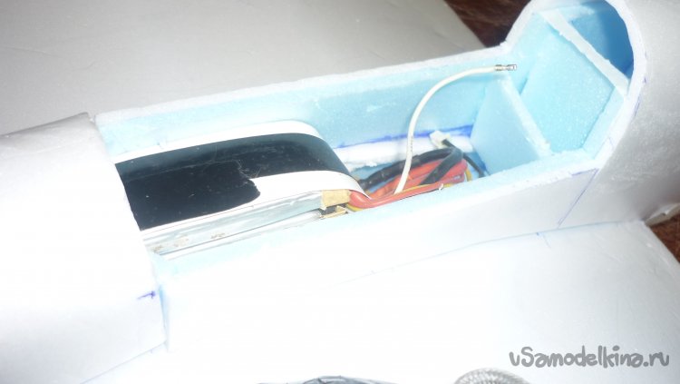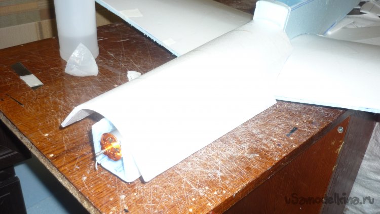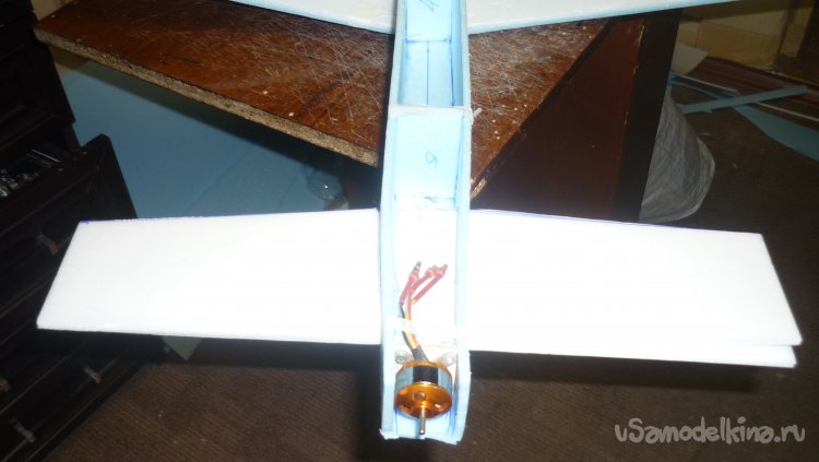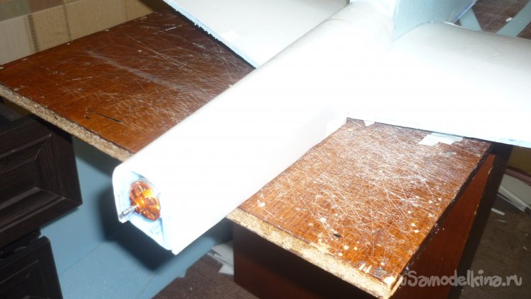 Из утеплителя вырезаю кусочки и вклеиваю их в носовой и хвостовой части фюзеляжа, на них вклеиваю кусочки 3 мм. фанеры, на которые монтирую моторы.