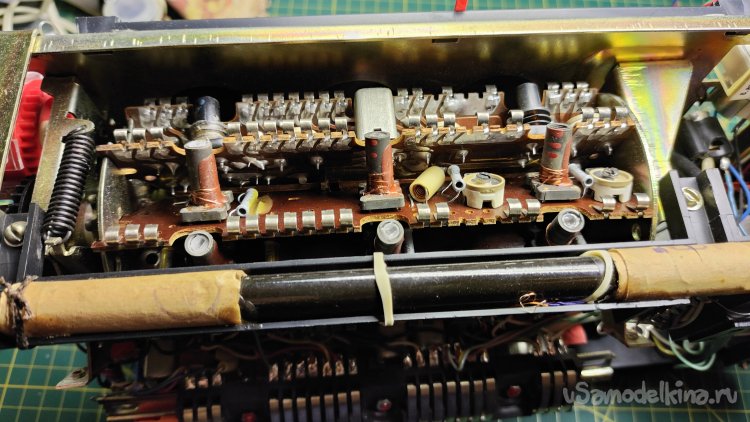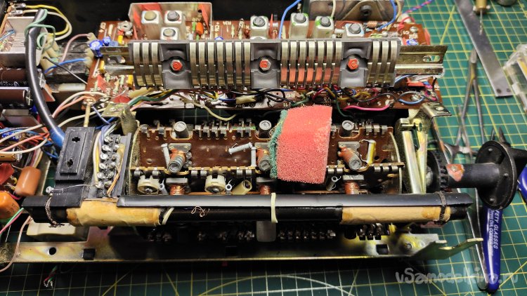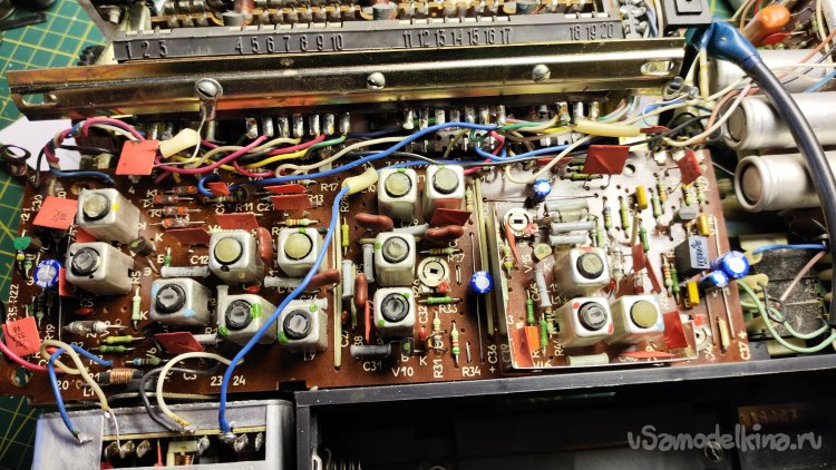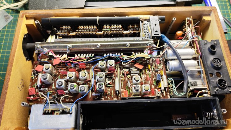Сверху находится галетный переключатель диапазонов со «страшным» названием «блок КСДВ». Под ним расположен блок РЧ-ПЧ, еще ниже блок УКВ в алюминиевом экране и батарейный отсек. Справа блок УЗЧ с элементами блока питания.