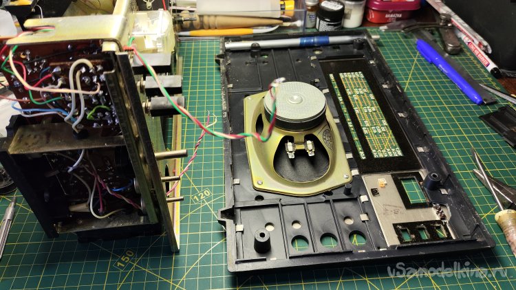 Снимаю переднюю панель, отпаивая провода от динамика и дополнительного переключателя.