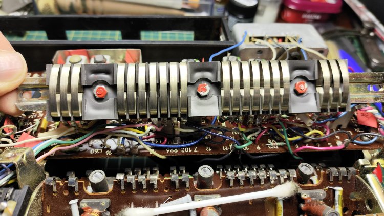 Ремонт регулятора громкости переносится на второй план, после снятия платы УЗЧ. Для начала займусь платой РЧ-ПЧ и галетным переключателем. Откручиваю два винта планки контактов галетного переключаеля.