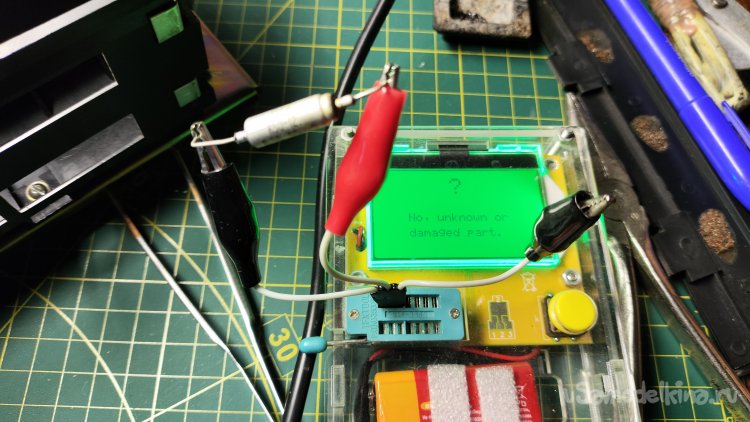 Пробую измерить емкость. Прибор не понимает, что к нему подключено. Конденсатор под замену.