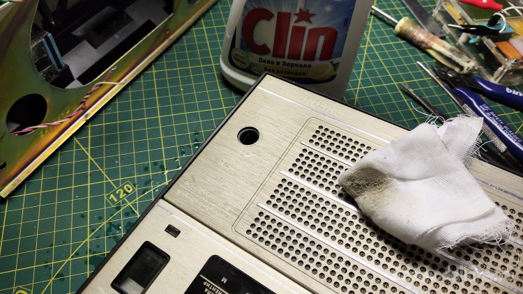 Займемся передней панелью. Приемник эксплуатировался продолжительное время. Была бы поверхность гладкая, грязь бы так не цеплялась.