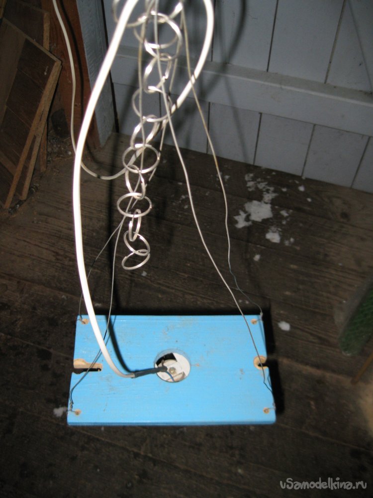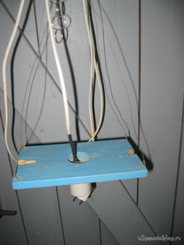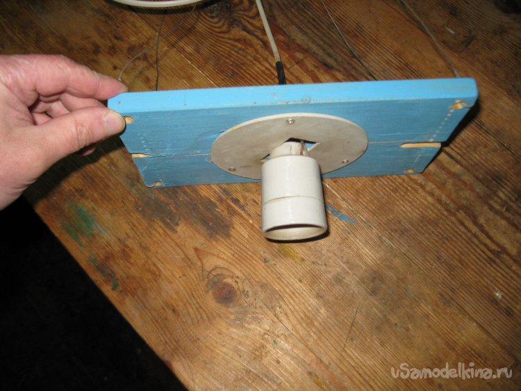 Однако когда я понял, что держатель лучше делать подвесным, я в дополнение к сетчатому плафону, сделал верхнюю часть держателя из небольшого отрезка дощечки.