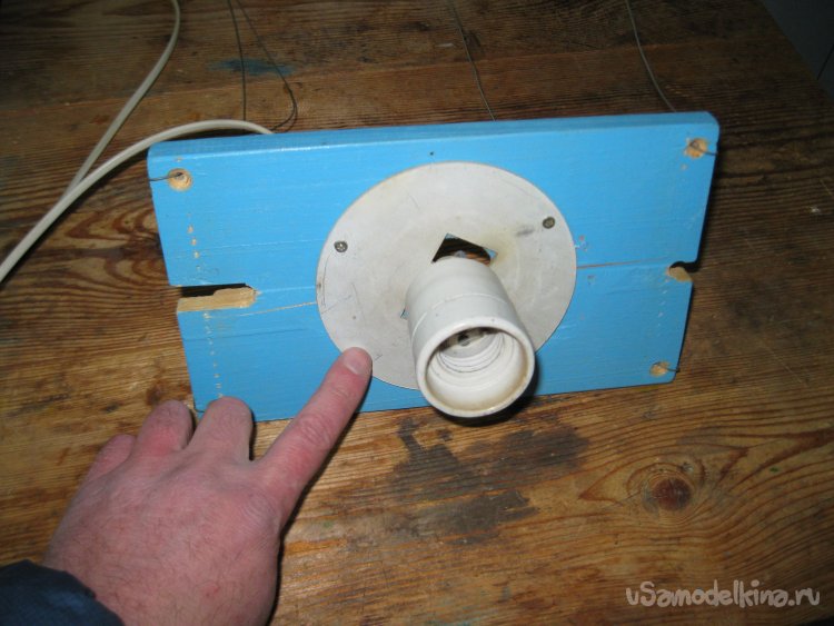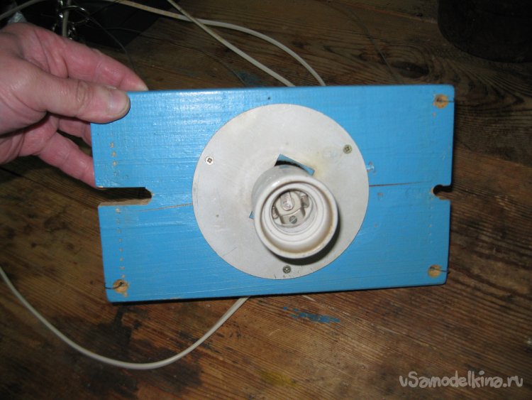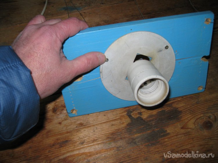 А само основание патрона при помощи шурупов прикрутил к нижней стороне дощечки. Кстати, сам керамический патрон с металлическим основанием, я нашел у себя среди хлама и разных запчастей, так что, и покупать ничего не пришлось.