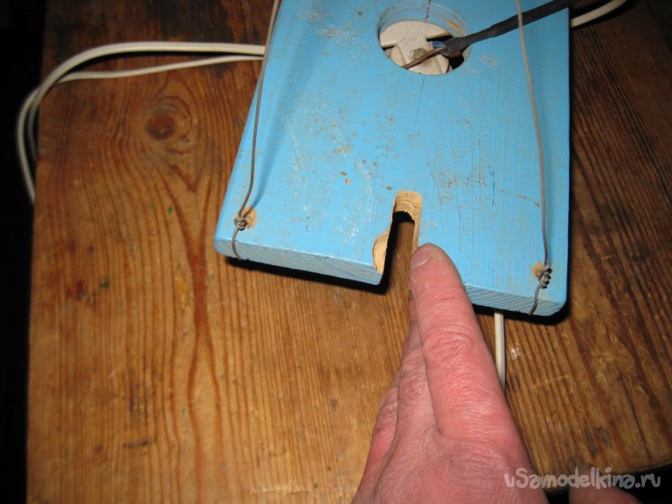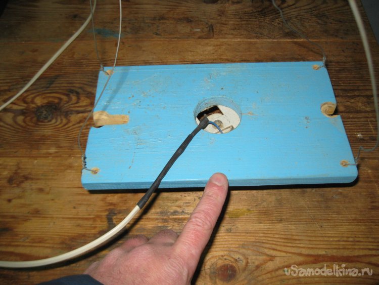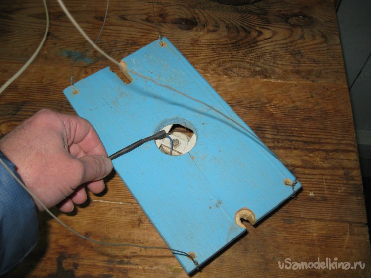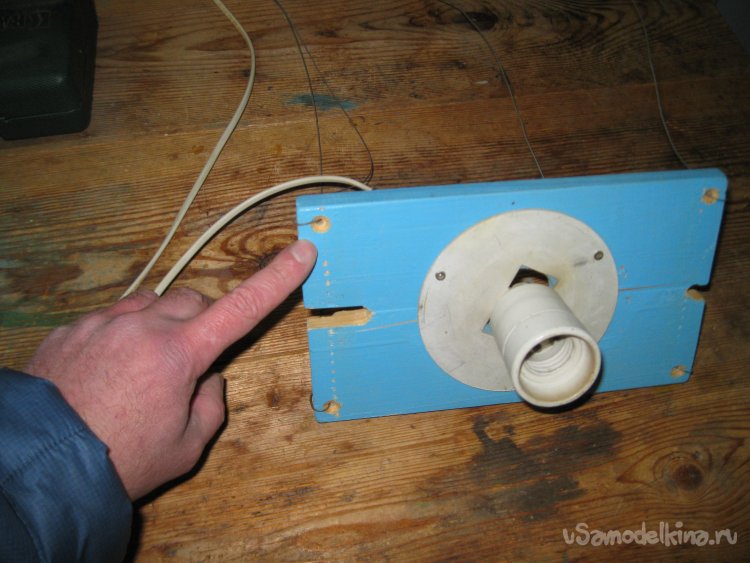 Сначала в центре этой дощечки, я при помощи коронки по дереву, просверлил сквозное отверстие диаметром 35 мм, для провода, а также для лучшего охлаждения патрона.