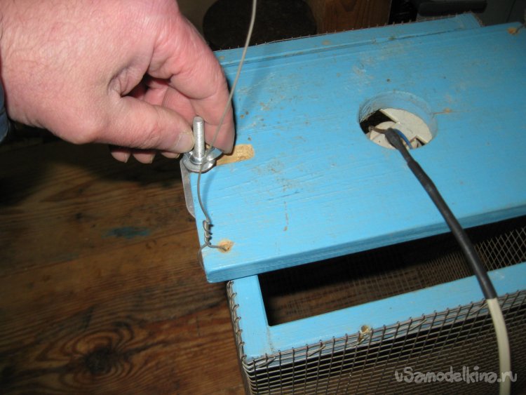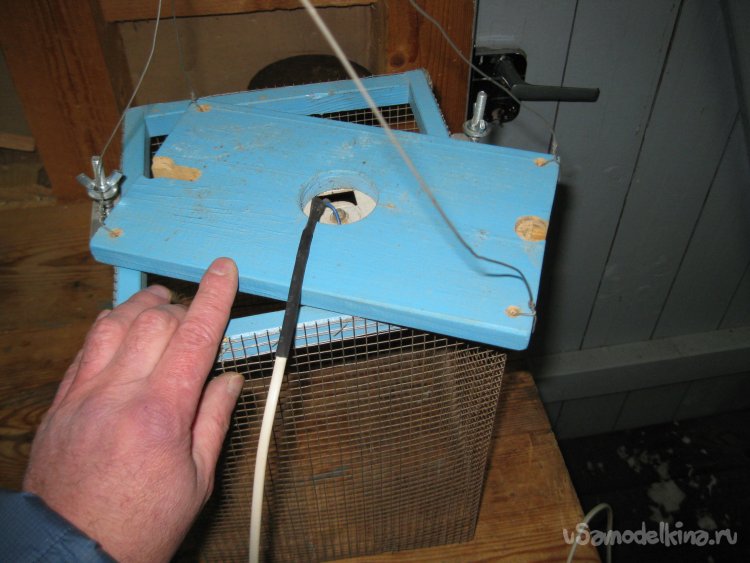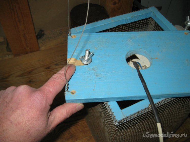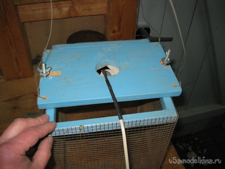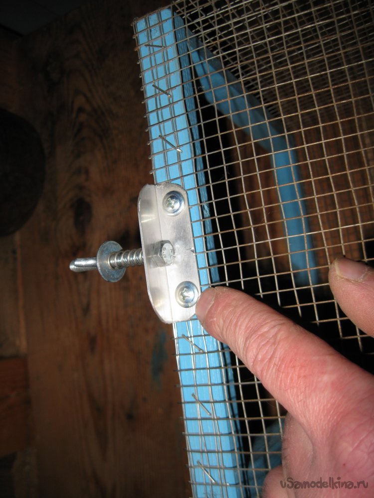 После этого, нужно было прикрепить плафон к верхней части держателя. При этом стояла задача сделать быстроразборное соединение, чтобы сетчатый плафон можно было быстро снимать и снова крепить к держателю. Тем более, практика использования инфракрасной лампы показала, что в условиях курятника сама лампа очень быстро покрывается слоем пыли и ее нужно периодически очищать.