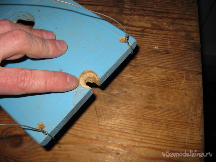Ну, а по торцам дощечки верхней части держателя, я при помощи обычного сверла по металлу, просверлил сквозные отверстия диаметром 8 мм, под болты, а также глухие отверстия под шайбы (при помощи перового сверла по дереву). А затем при помощи электролобзика сделал пропилы для того, чтобы верхнюю часть держателя можно было сдвигать при креплении сетчатого плафона.