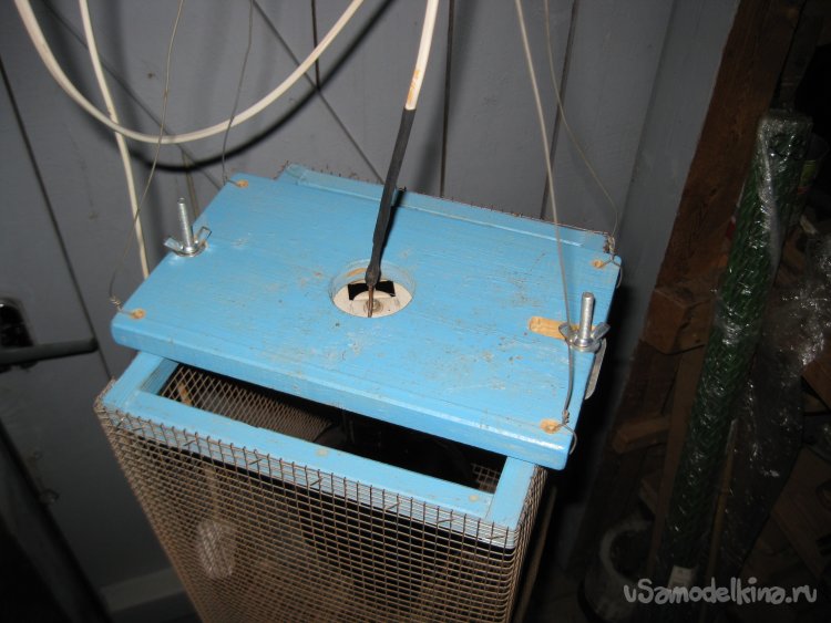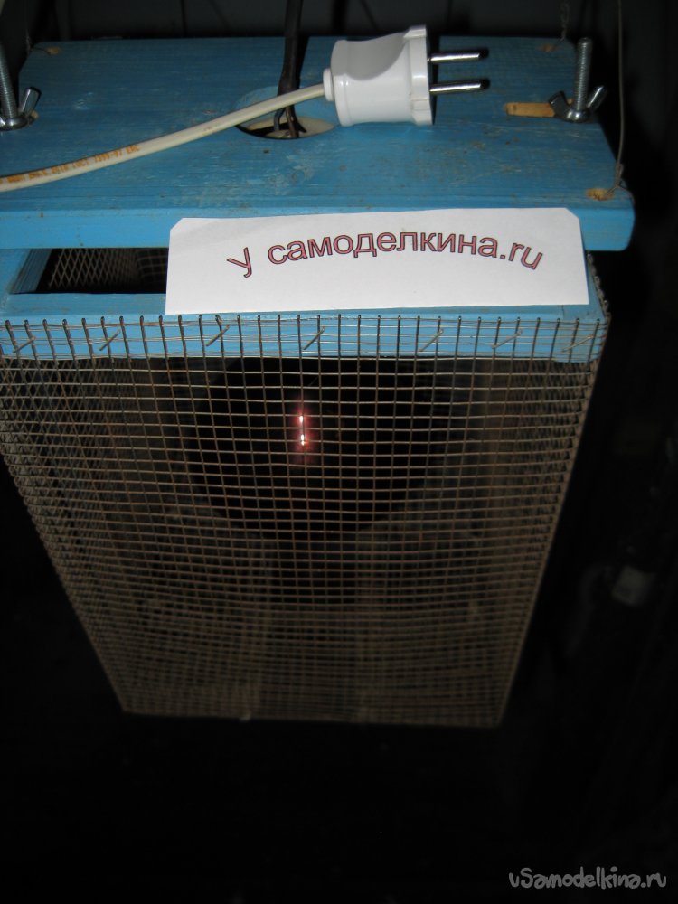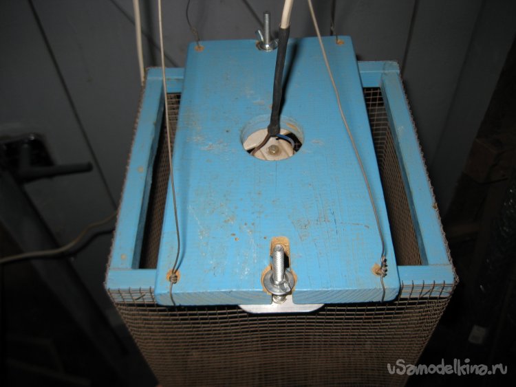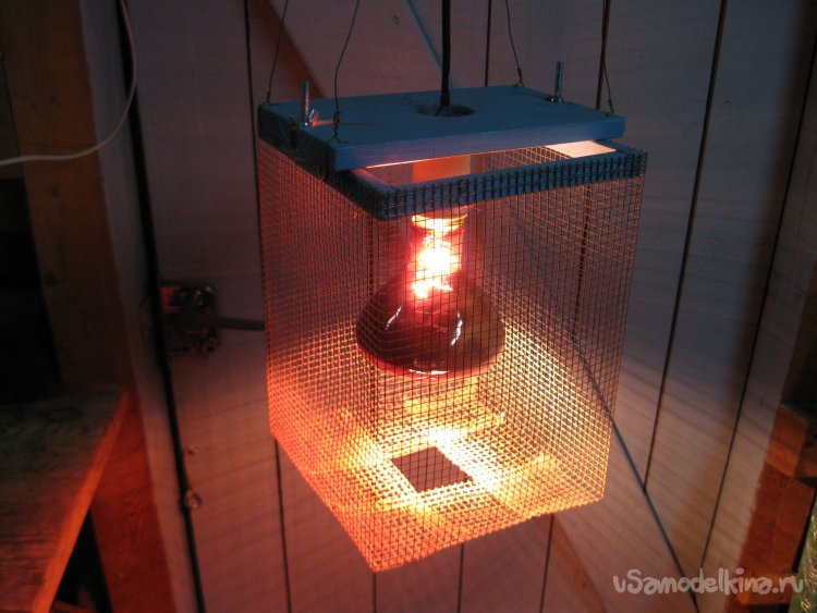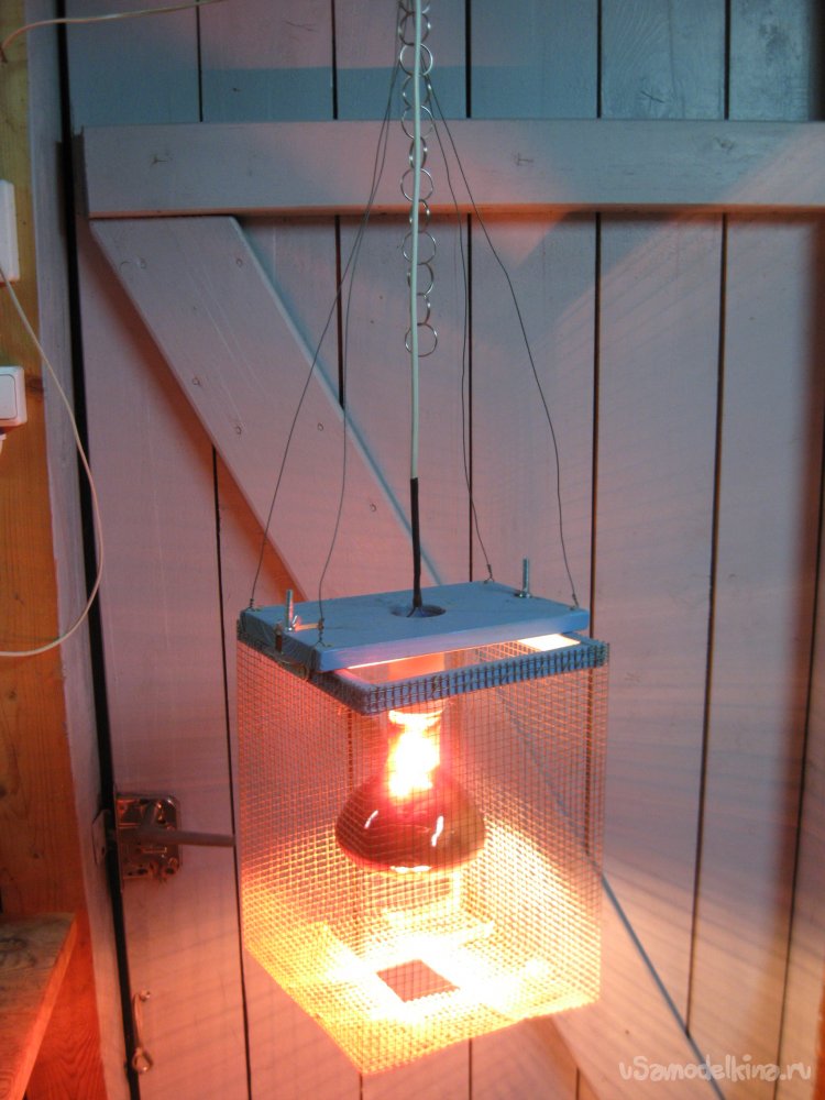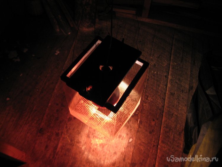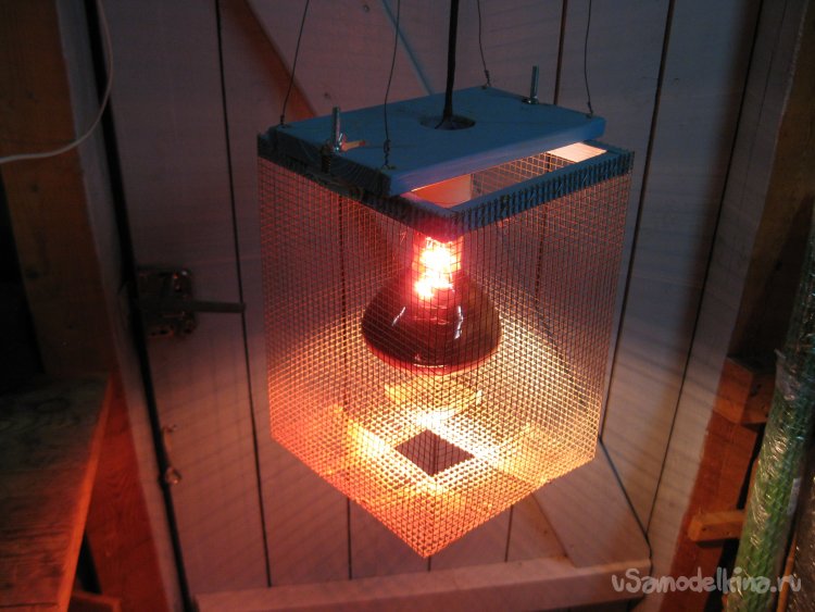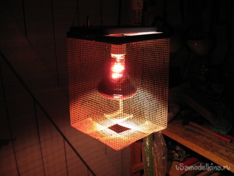 Именно поэтому для безопасности, инфракрасную лампу нужно обязательно защищать какой-нибудь металлической сеткой. Я же пошел еще дальше, и еще несколько лет назад, сделал специальный подвесной держатель для такой лампы со съемным сетчатым плафоном. Правда, потом, в этом устройстве выявились некоторые недостатки, которые я постепенно дорабатывал в течение нескольких лет. В итоге, примерно год назад, держатель приобрел свой окончательный вид и стал удовлетворять всем моим требованиям.