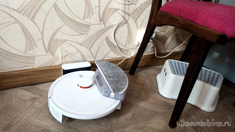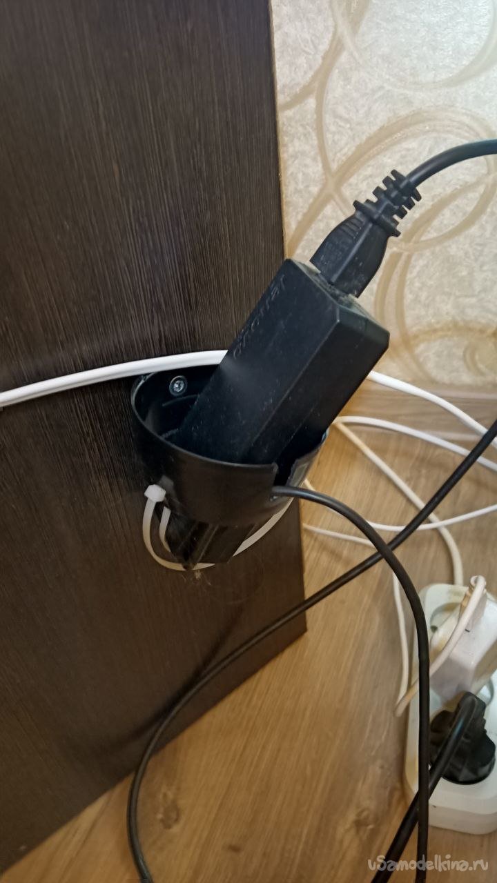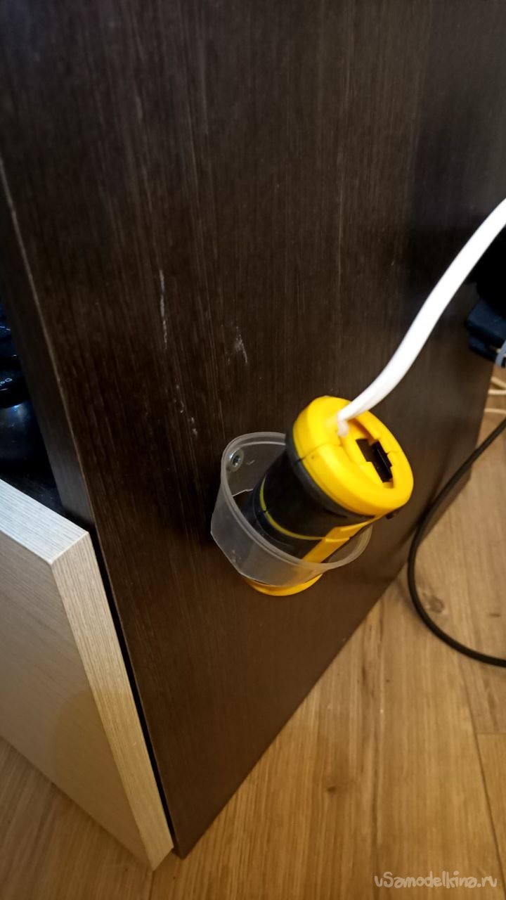 Следующий этап: приспосабливание нашей квартиры под робота-пылесоса. Он у нас появился недавно, но сразу всем понравился. Всё с ним хорошо, но перед запуском его в работу надо убрать всё с пола, особенно провода, иначе он не будет пылесосить-мыть под ними. Поэтому пришлось к тумбочке сбоку прикрутить несколько обрезков пластиковых бутылок для размещения пульта от подъёмного механизма экрана для проектора и блока питания ноутбука. Оно и к лучшему, пульт теперь стал ближе и не надо шарить рукой по полу в его поиске. Чтобы не портить тумбочку, были использованы мебельные стяжки, которыми она и собрана. Открутил стяжку, отверстие в пластике просверлил, насадил, обратно прикрутил.