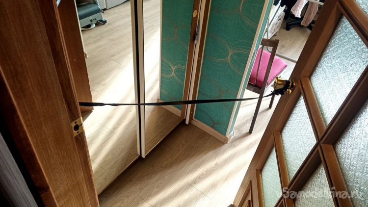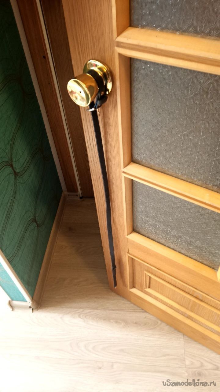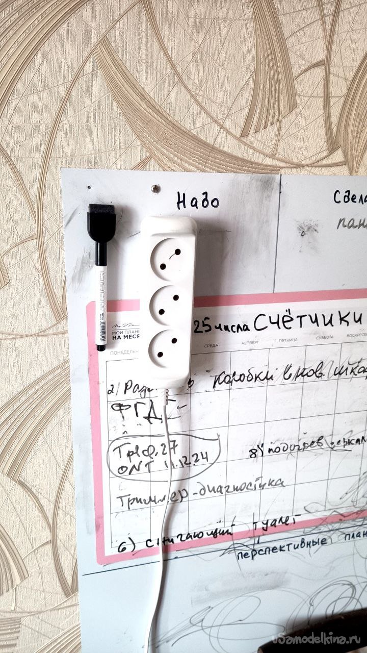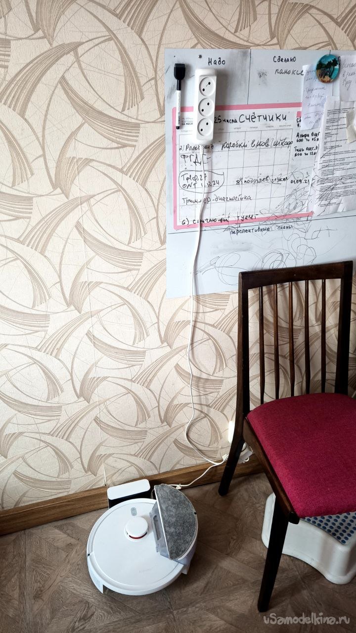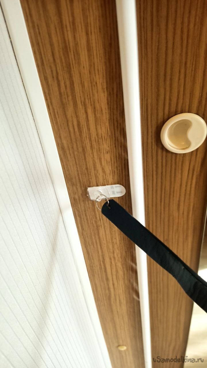 И ещё немного про робота-пылесоса. В одной из комнат пришлось придумать ремень-держатель двери в полуоткрытом состоянии. Если полностью её, дверь, отпустить, она призакроется, но так, что за ней пылесос полы мыть не будет, и вот поэтому жена изобрела такой способ. Теперь наш Кузя пылесосит-моет всё в этой комнате, аккуратно обходя дверь. Старый ремешок, клипса-крючок на самоклейке, и большая проблема решена. А на кухне, где на полу жил удлинитель для утюга, пришлось тоже придумать приклеить неодимовый магнит к тройнику. Теперь его место висеть на металлической доске-напоминалке, а не валяться на полу.