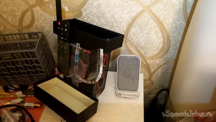 Доброго всем дня, сегодня будем делать необычный аксессуар. Я долго пытался придумать ему название, но короткое и путёвое так и не удалось придумать. Зачем это нужно? На моей прикроватной тумбочке живёт много интересного. Четыре пульта (от телевизора, телеприставки, проектора и колонки-саундбара). Беспроводное зарядное устройство для смартфона, очки. Раньше это всё хаотично располагалось на тумбочке и приходилось (порой и в темноте) разыскивать нужную приблуду. Кроме того, если кто жил в Питере летом, белые ночи напрягают, лишая сна. Для борьбы с этим были сделаны жалюзи «блэкаут», то есть почти 100% светонепроницаемые. Жалюзи классные, но в полной темноте свет от зарядки для смартфона практически лишает сна. И вот, поразмышляв, я решил сделать то, что получилось.