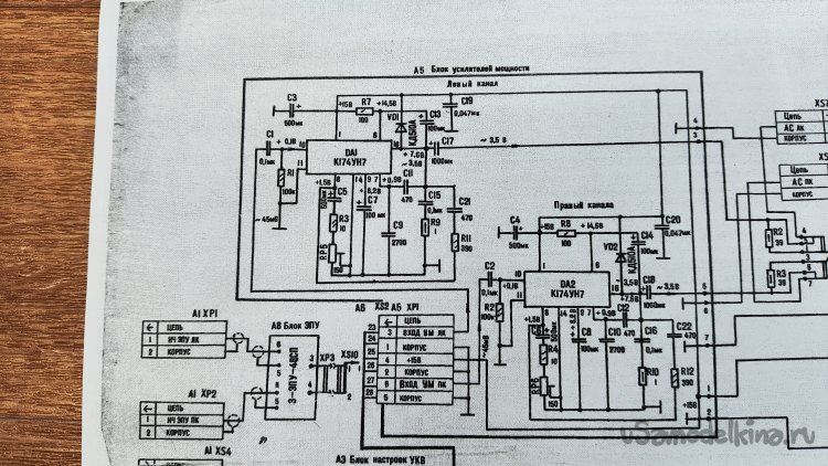 Выходные усилители построены на весьма распространённых тогда микросхемах К174УН7. Такие же ИМС стоят в Маяке-233 и в моем первом кассетнике Соната-216.