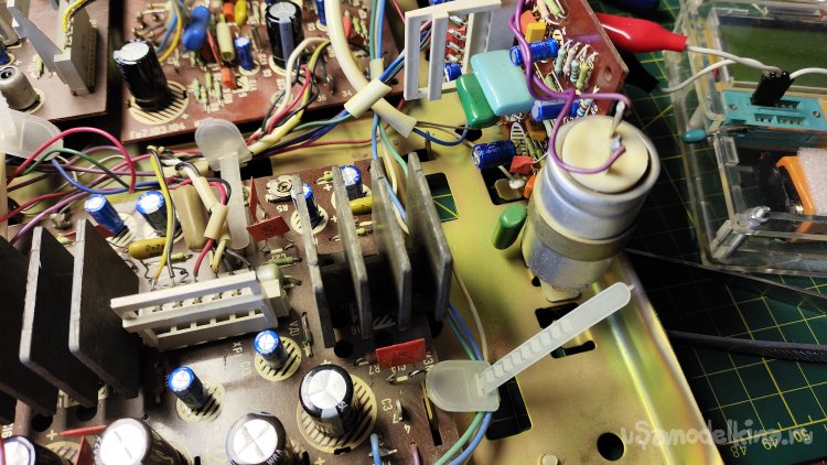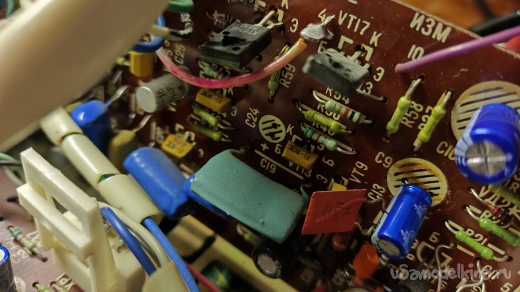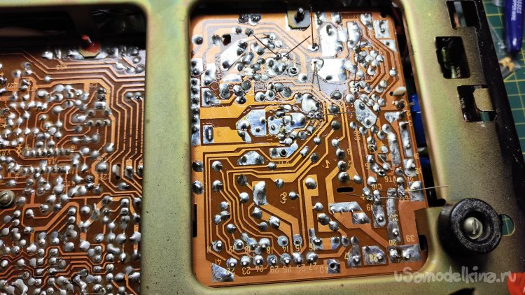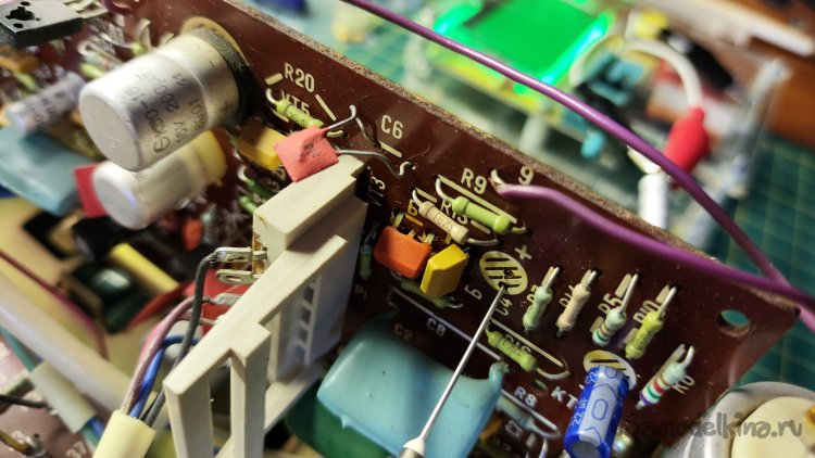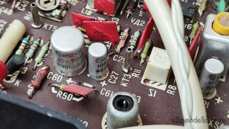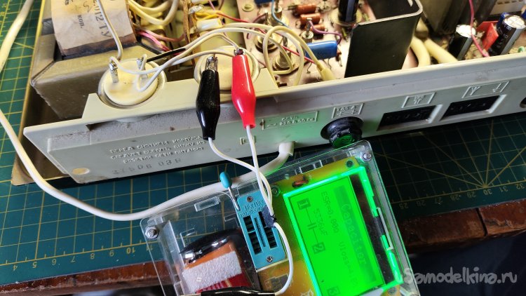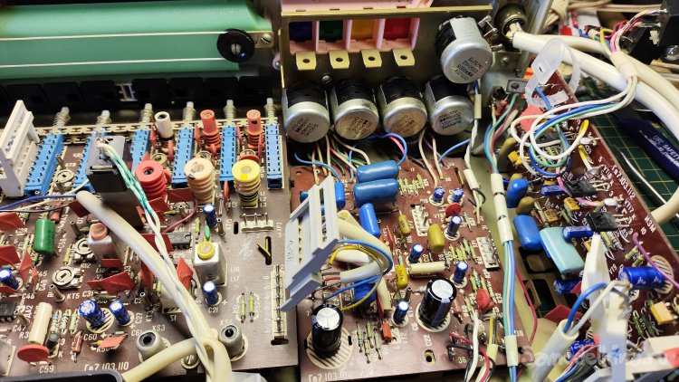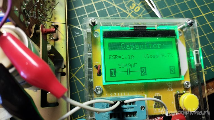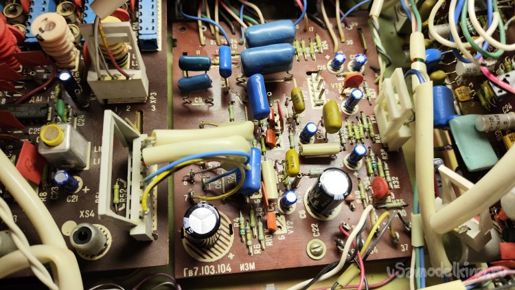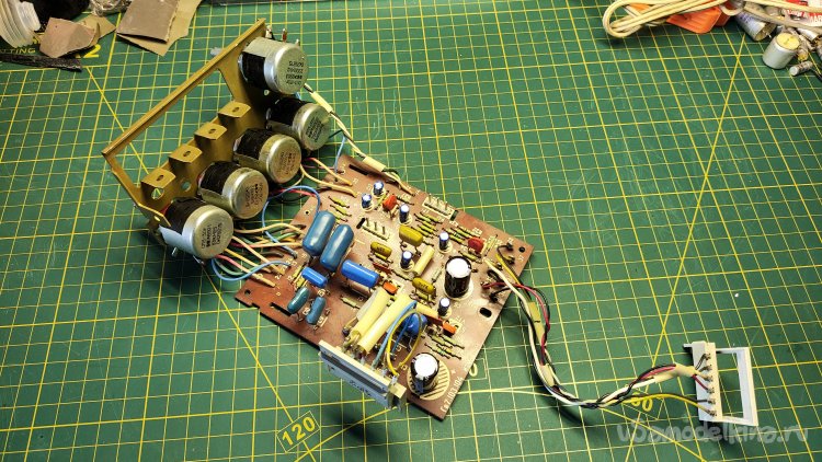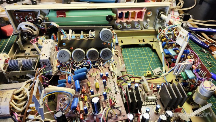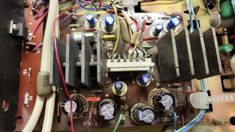 Первым делом заменил конденсаторы на плате усилителя мощности. Каждый выпаянный конденсатор проверил. Емкость была в пределах нормы. Ну как была в пределах, в основном зашкаливала в полтора-два раза, что типично для советских электролитических конденсаторов.