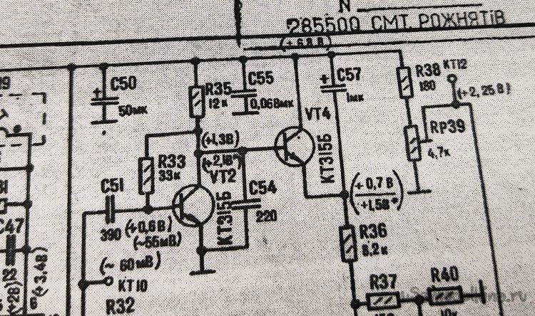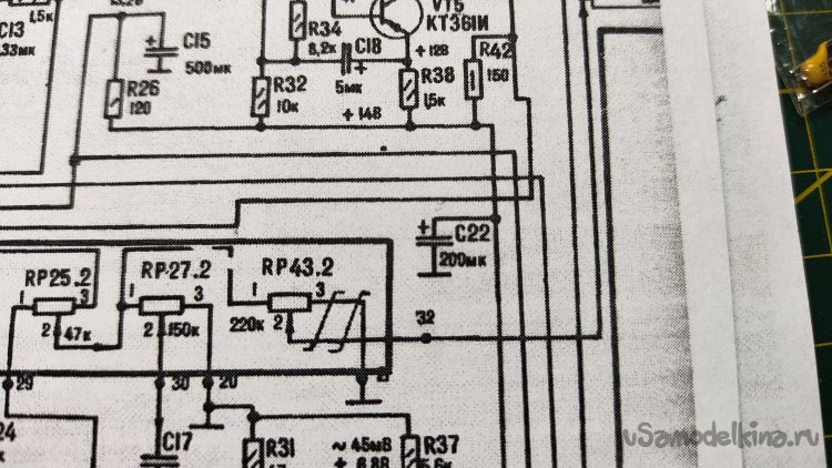 А это у нас конденсатор темброблока. Из заявленных 200мкФ осталось 156, а может столько и было. Вот он на схеме С22. Фильтрует питание темброблока.