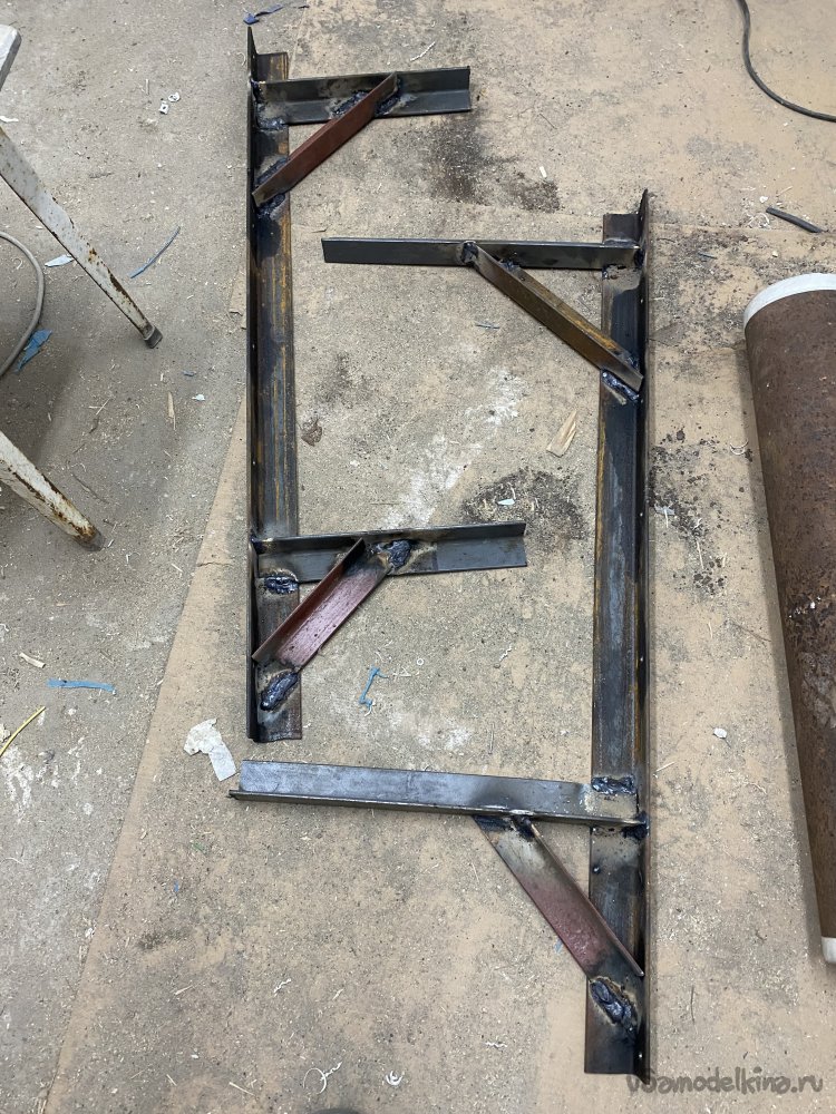 Крепление дымохода я решил изготовить из уголка 50х50, с толщиной стенки 5 миллиметров. Сперва сварил из него два вот таких "зеркальных" кронштейна: