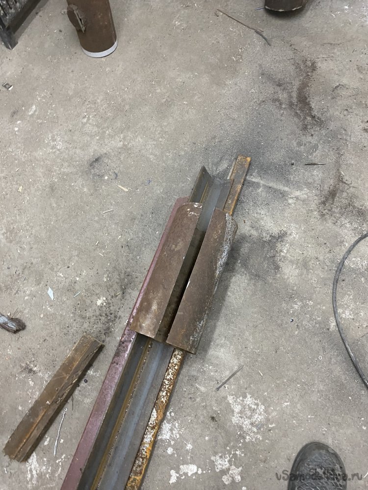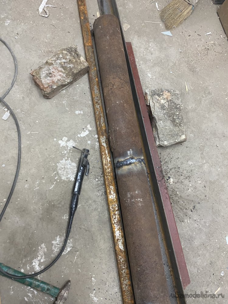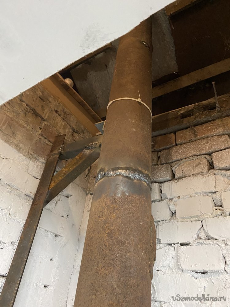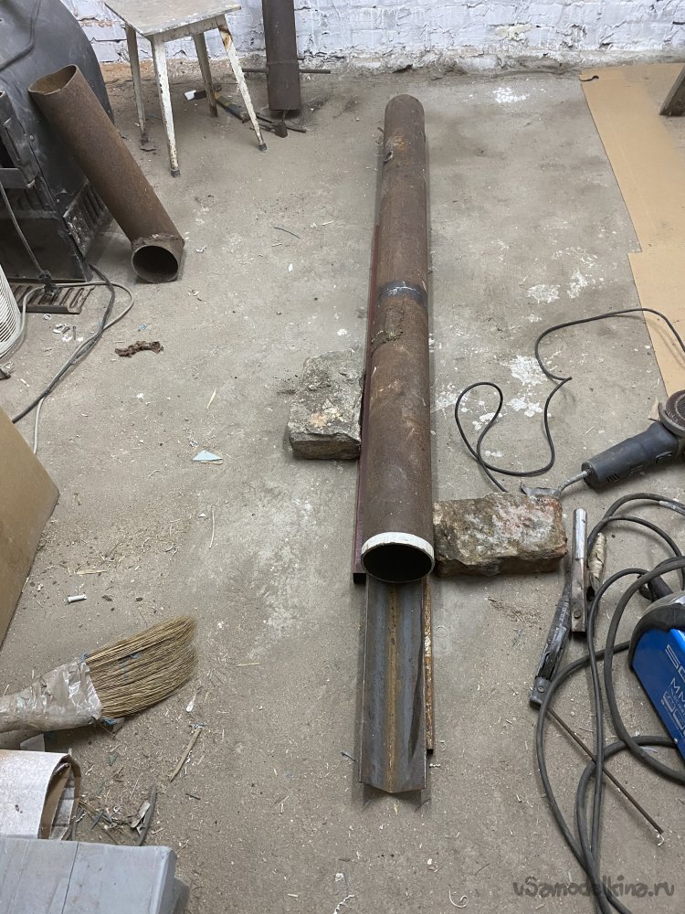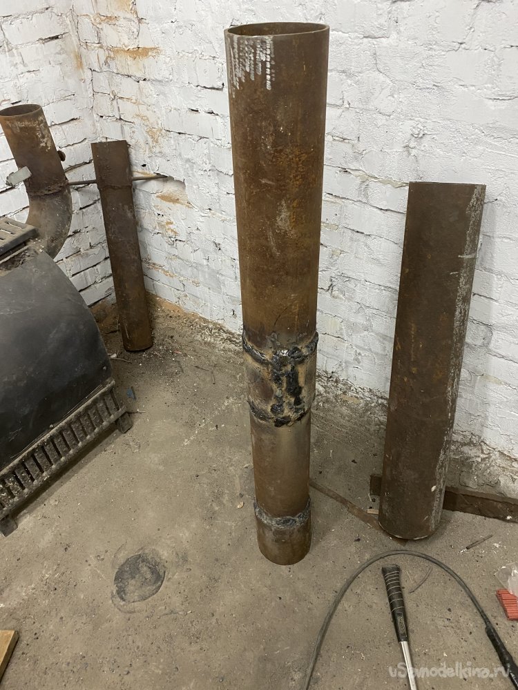 Первым делом я решил изготовить внутренний дымоход. От печки до кровли. Для этого имеющаяся труба была порезана и сварена, образовав прямой отрезок: