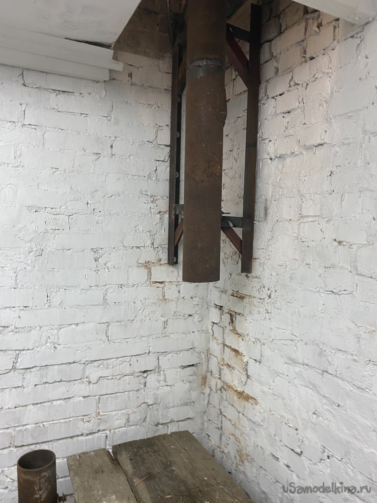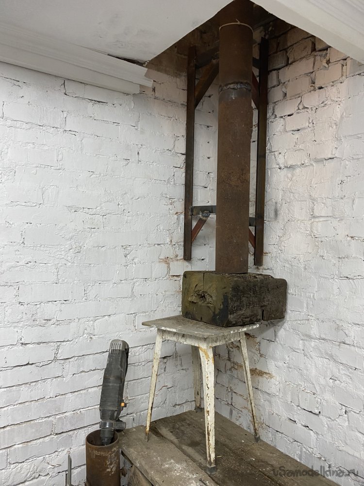 Дымоход из таких труб, высотой около пяти метров, будет иметь приличный вес! Необходимо его как-то закрепить, так ка он не может опираться на саму печку. Он её попросту опрокинет.