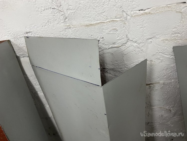 Обрезал их по длине моего дымохода, а также, срезал наружные отгибы. Получились уголки из жести: