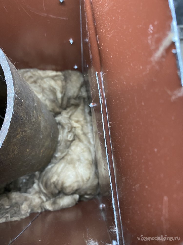 Утрамбовывая длинным бруском, заполнил всё пространство между трубой и коробом минеральной ватой: