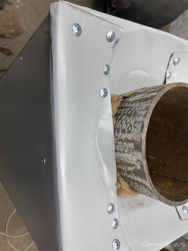 Пройти сквозь наклонную шиферную кровлю, и сделать качественное примыкание лучше квадратным сечением! Круглым сечением это сделать практически не возможно. Поэтому, наружный кожух моего утеплённого дымохода я решил сделать квадратным.