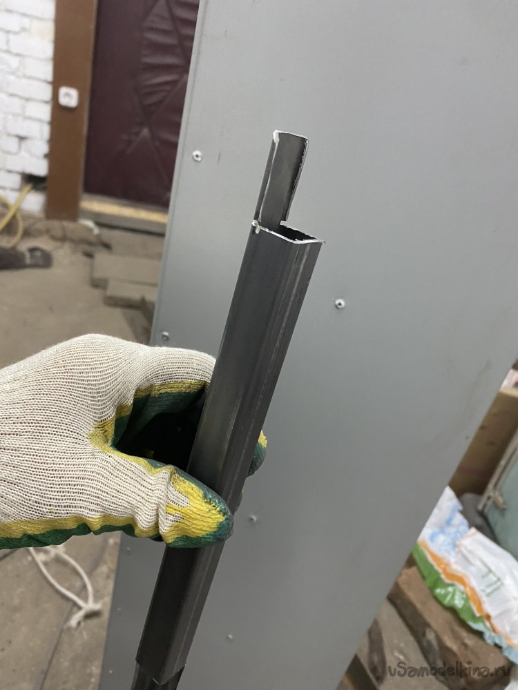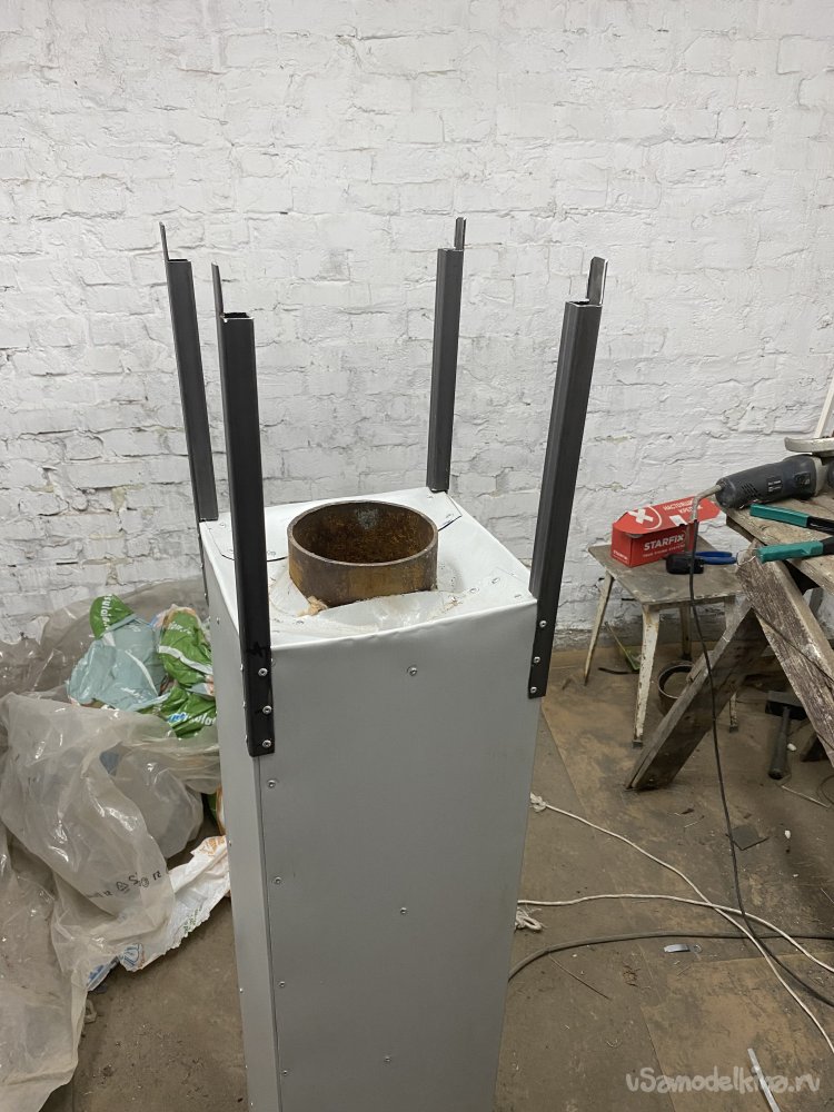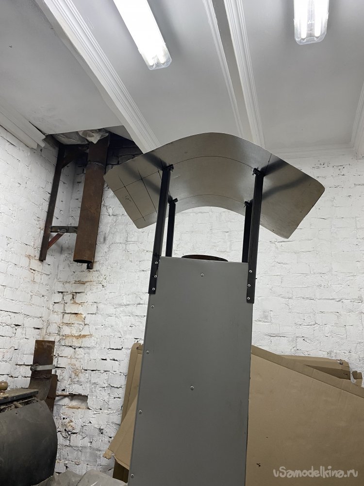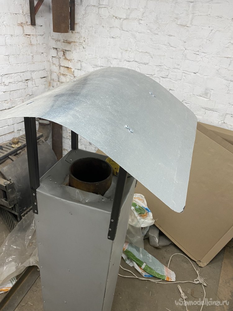 Над выходом дымохода необходимо сделать зонт. (Или колпак, как его в простонародии называют)). Наиболее простая его конструкция представляет собой лист жести, согнутый дугой и закреплённый на стойках. Такую я и решил сделать. Стойки зонта я изготовил из профильной трубы, сечением 20х20 мм: