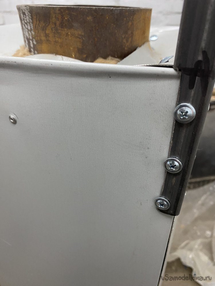 Но такое крепление не особо крепкое. Да и торчащие внутри шурупы будут мне мешать запихивать внутрь утеплитель. Поэтому, после сборки, просто, по одному, заменил шурупы вытяжными заклёпками 3,2х10. Они прекрасно подходят к отверстиям, оставшимся после шурупов.