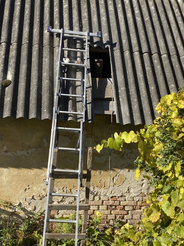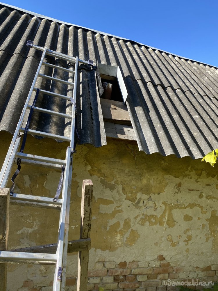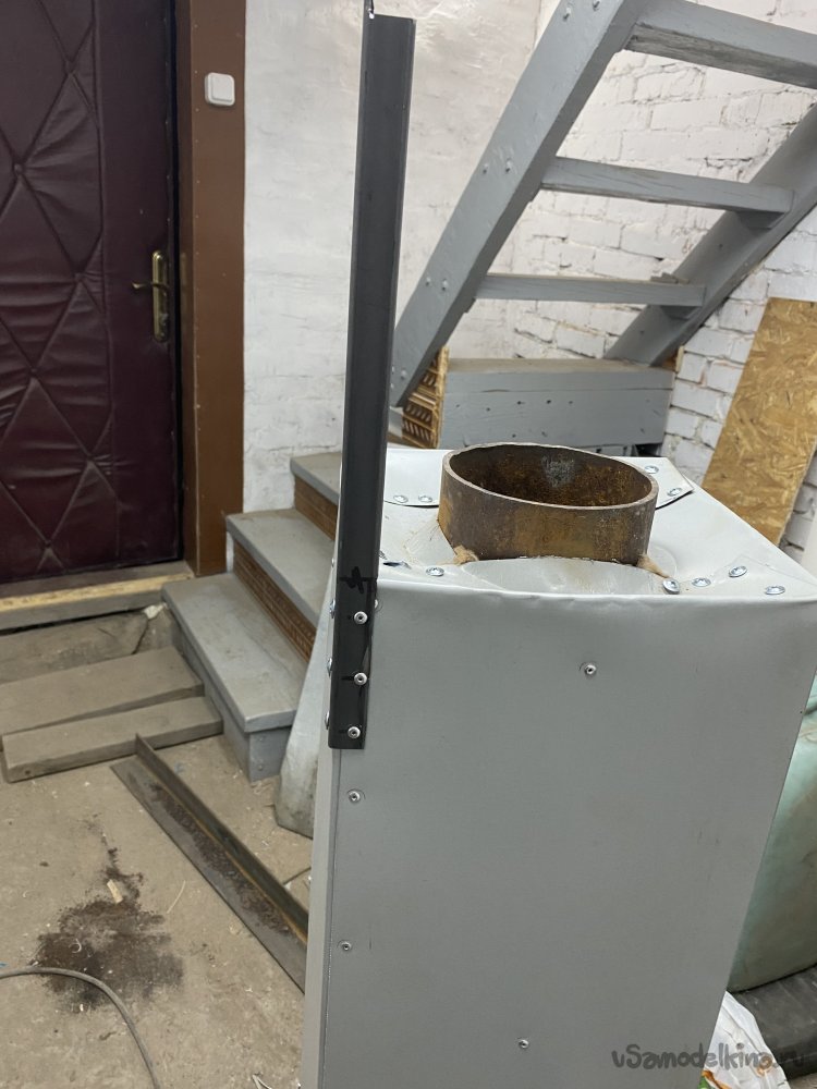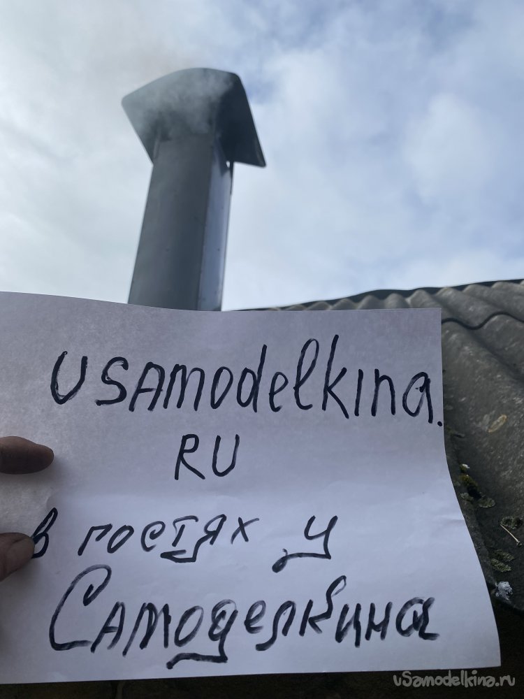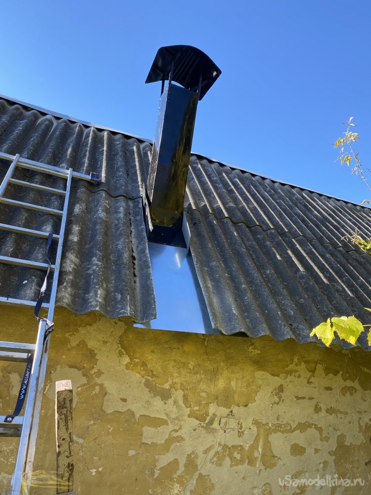 И установил дымоход. Наиболее тяжёлым было в одиночку поднять его по лестнице на крышу, так как толстостенная труба, короб и минвата весили в совокупности прилично. Но удалось.